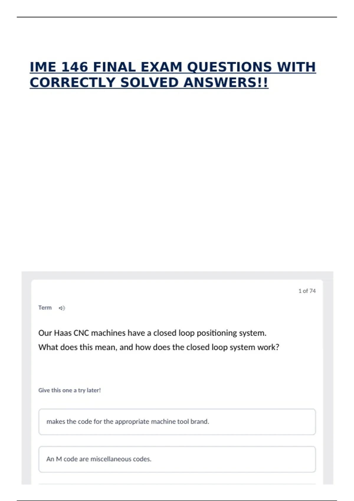 IME 146 FINAL EXAM QUESTIONS WITH