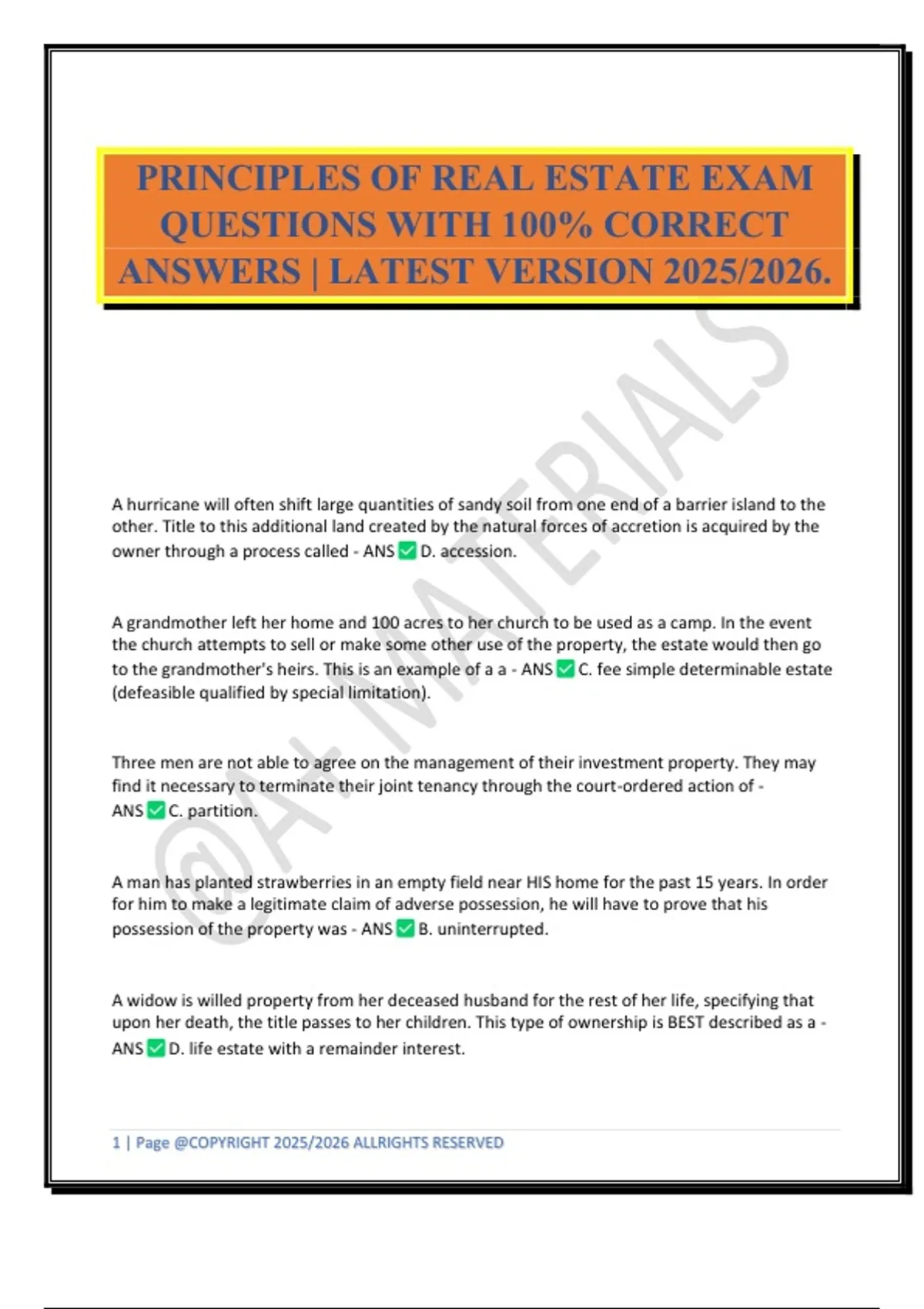 PRINCIPLES OF REAL ESTATE EXAM QUESTIONS WITH 100% CORRECT ANSWERS | LATEST VERSION 2025/2026.