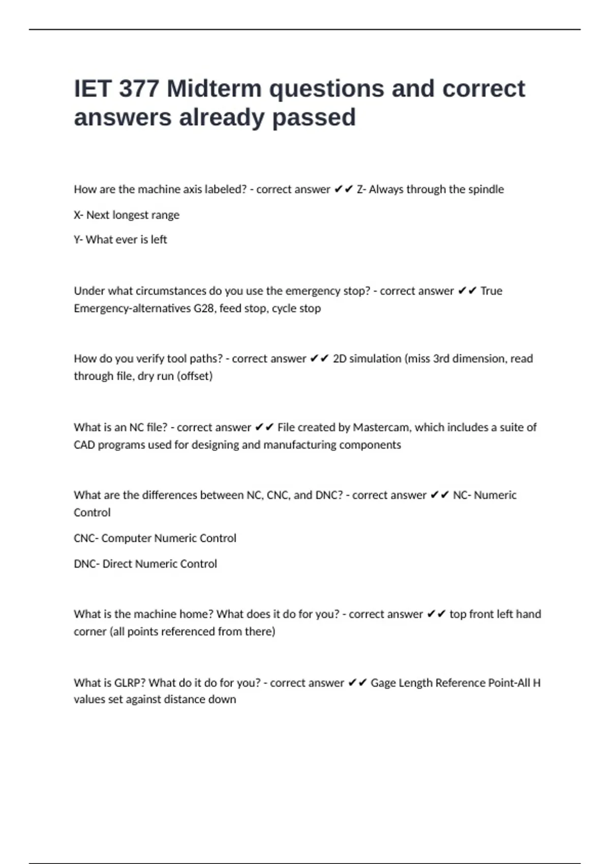 What is an NC file? - correct answer ✔✔ File created by Mastercam, which includes a suite of