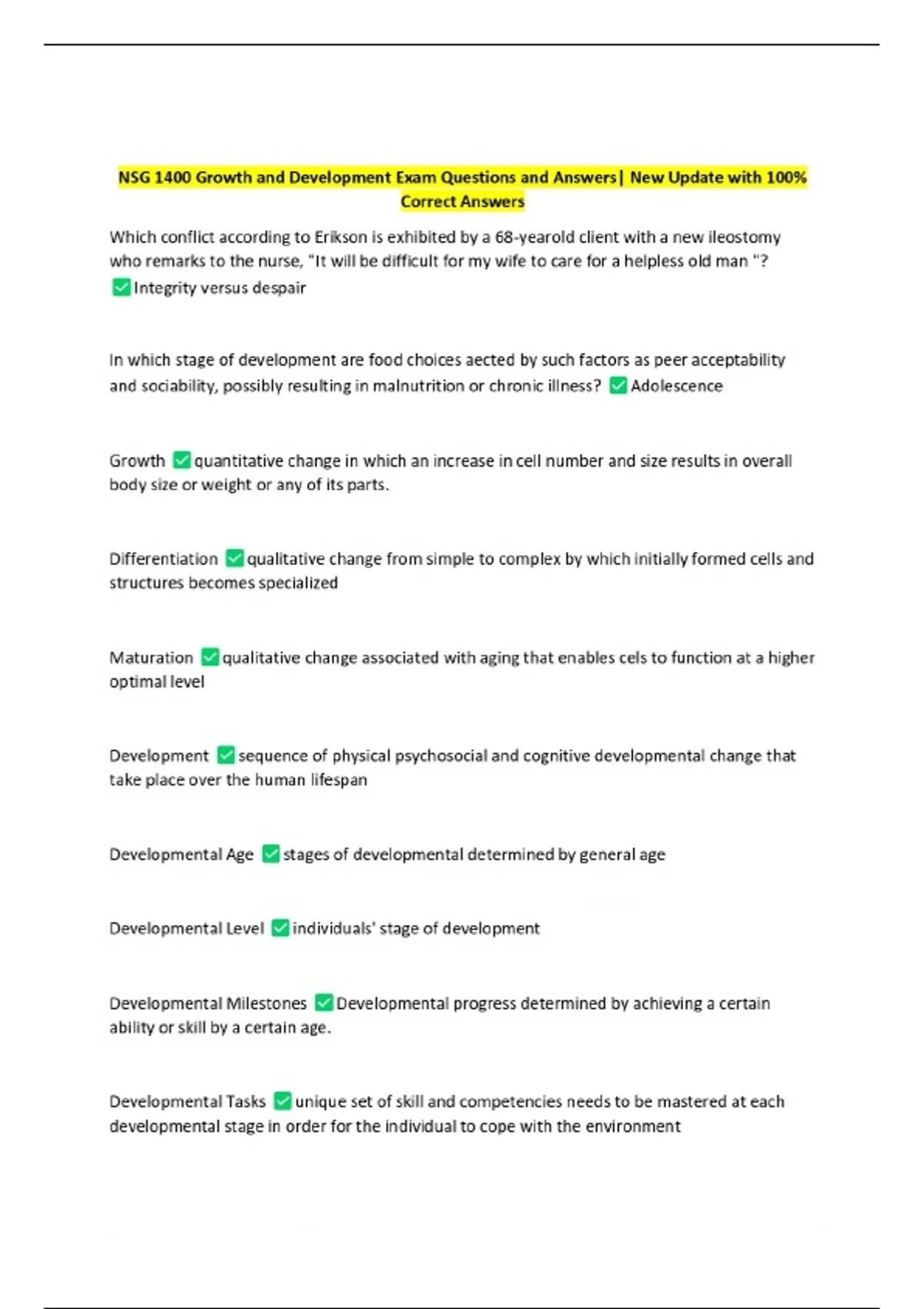 NSG 1400 Growth and Development Exam Questions and Answers| New Update with 100% Correct Answers