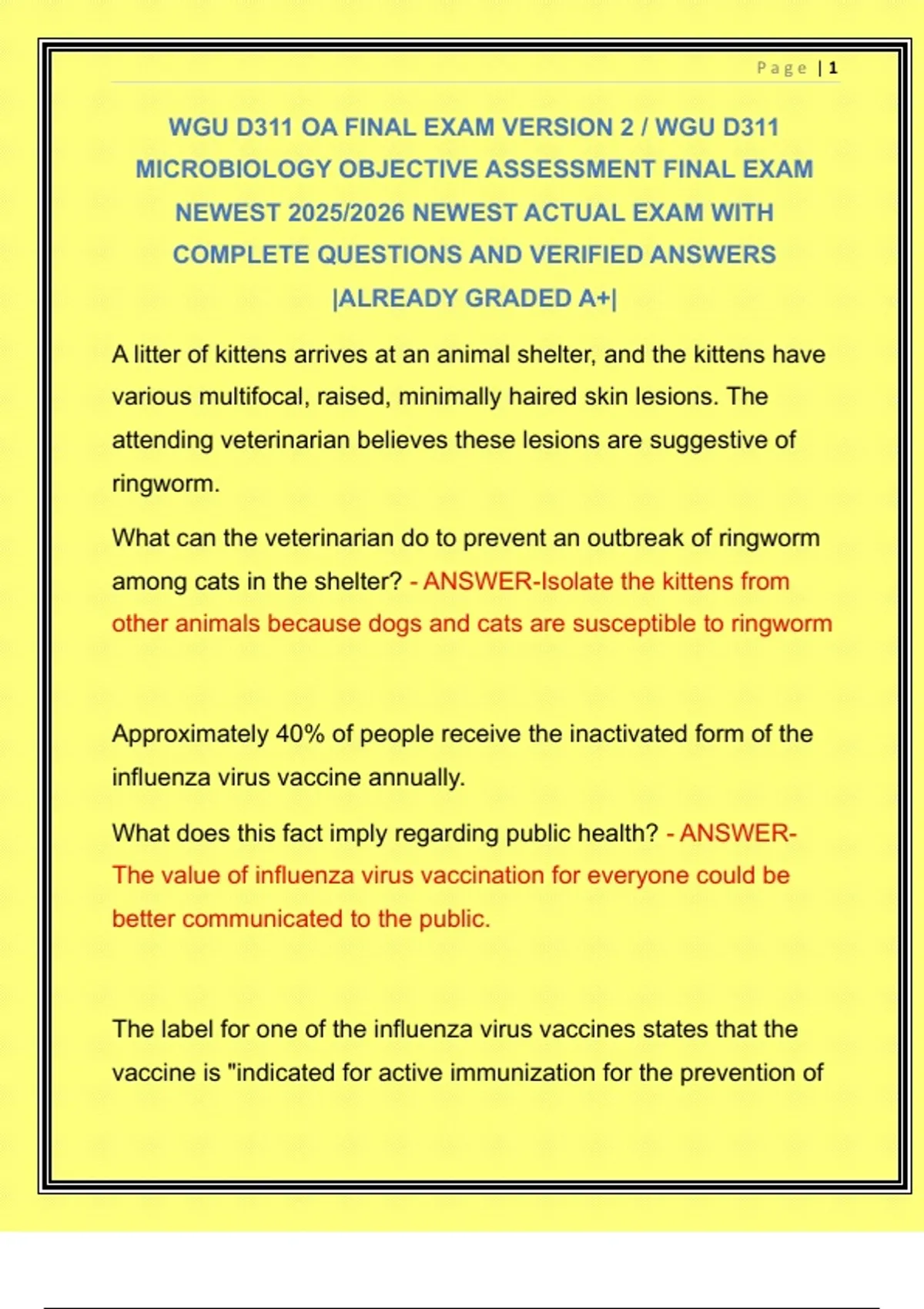 WGU D311 OA FINAL EXAM VERSION 2 / WGU D311 MICROBIOLOGY OBJECTIVE ASSESSMENT FINAL EXAM NEWEST 2025/2026 NEWEST ACTUAL EXAM WITH COMPLETE QUESTIONS AND VERIFIED ANSWERS |ALREADY GRADED A+|