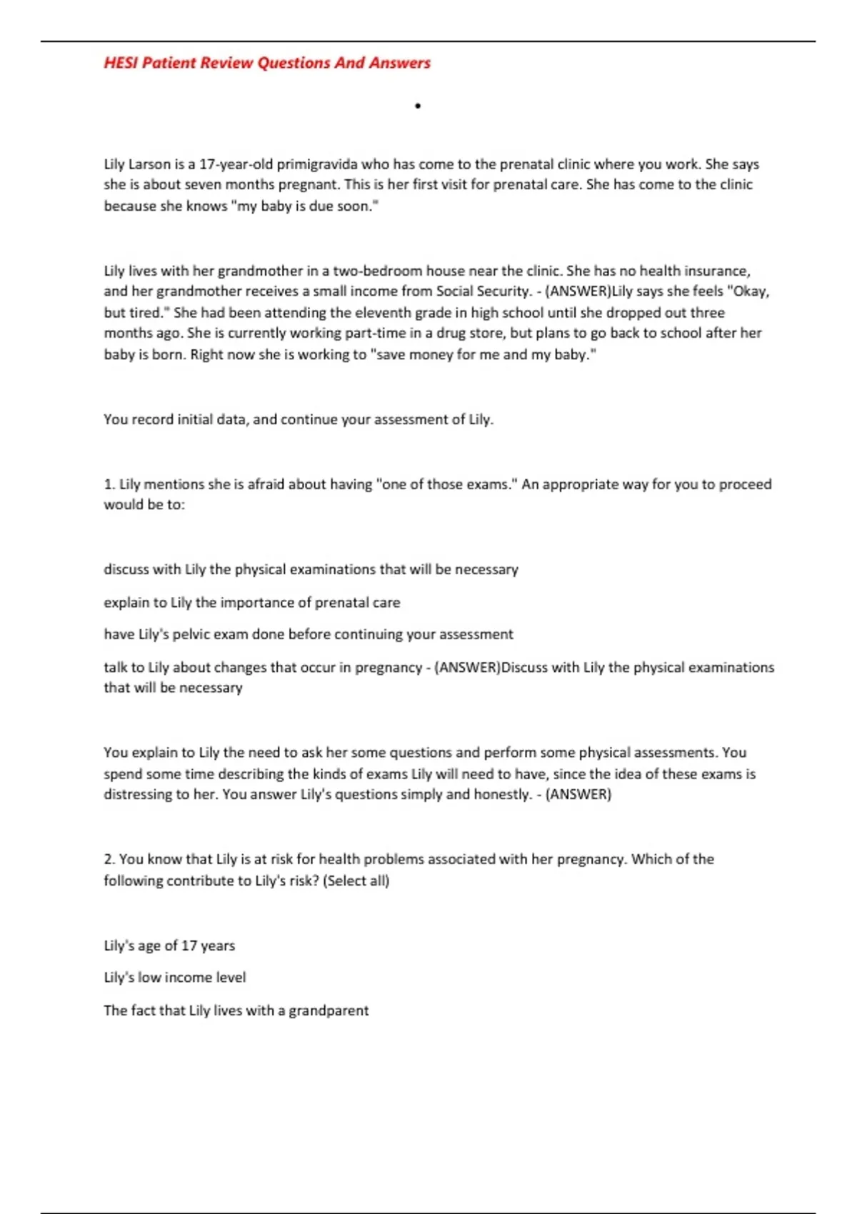 2. You know that Lily is at risk for health problems associated with her pregnancy. Which of the