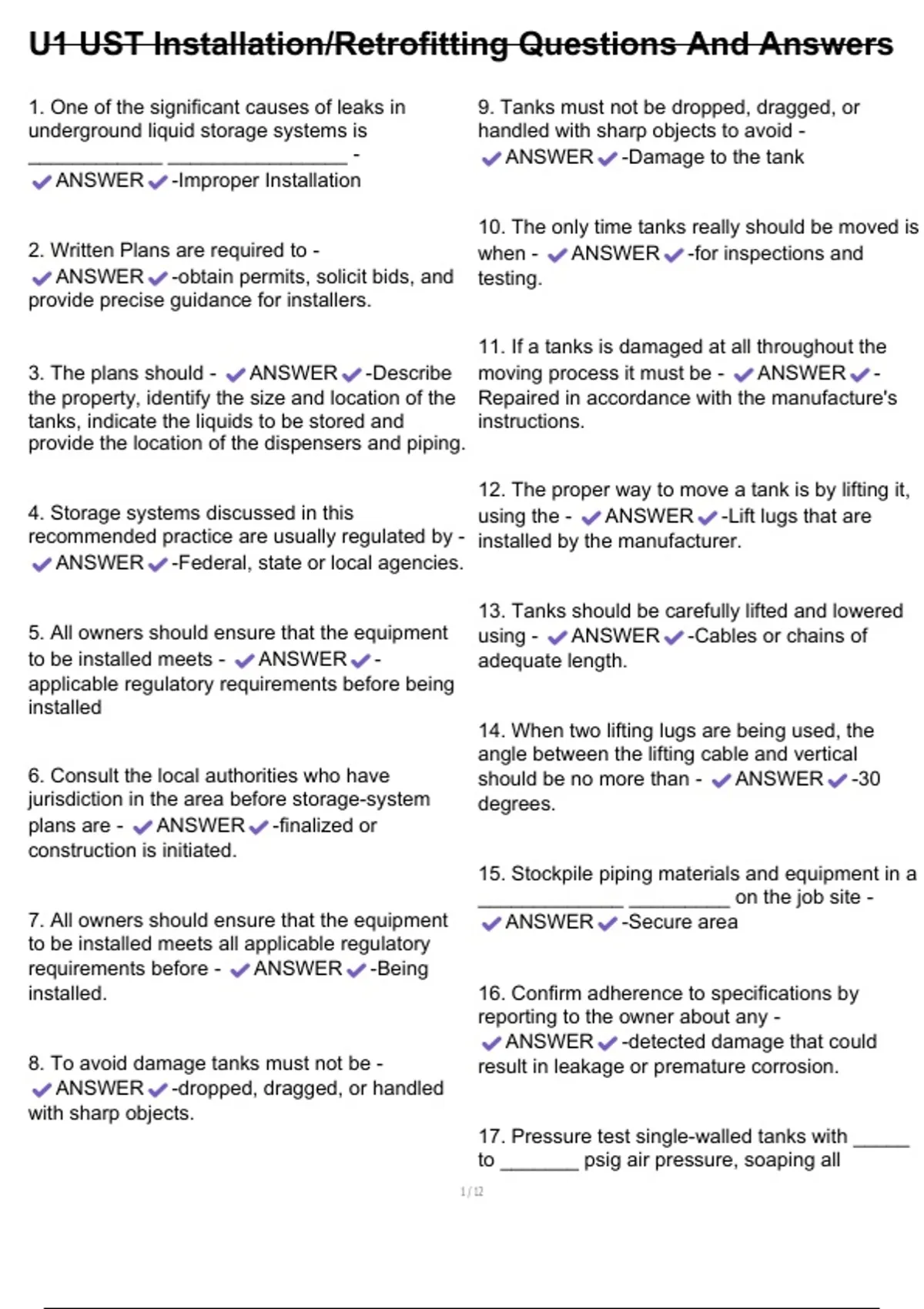 1. One of the significant causes of leaks in underground liquid storage systems is ____________ ________________ - ANSWER -Improper Installation 2. Written Plans are required to - ANSWER -obtain permits, solicit bids, and provide precise guidance for installers. 3. The plans should - ANSWER -Describe the property, identify the size and location of the tanks, indicate the liquids to be stored and provide the location of the dispensers and piping. 4. Storage systems discussed in this recommended practice are usually regulated by - ANSWER -Federal, state or local agencies. 5. All owners should ensure that the equipment to be installed meets - ANSWER - applicable regulatory requirements before being installed 6. Consult the local authorities who have jurisdiction