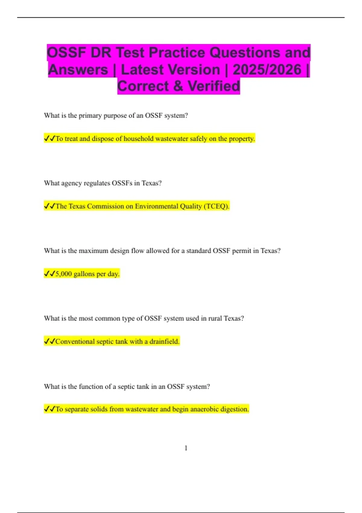 OSSF DR Test Practice Questions and Answers | Latest Version | 2025/2026 | Correct & Verified What is the primary purpose of an OSSF system? To treat and dispose of household wastewater safely on the property. What agency regulates OSSFs in Texas? The Texas Commission on Environmental Quality (TCEQ). What is the maximum design flow allowed for a standard OSSF permit in Texas? 5,000 gallons per day. What is the most common type of OSSF system used in rural Texas? Conventional septic tank with a drainfield. What is the function of a septic tank in an OSSF system? To separate solids from wastewater and begin anaerobic digestion. 2 What is effluent in OSSF terminology? Partially treated wastewater discharged from a septic tank or treatment unit. What is the purpose of a soil absorption system? To filter and further treat effluent by percolation through soil. What type of soil is least suitable for a standard drainfield? Clay soil. What is a percolation test used for in OSSF design? To measure how quickly water soaks into soil. What is the minimum horizontal separation distance from a septic tank to a private water well? 50 feet. What is the minimum separation distance from an absorption field to a private water well? 100 feet. 3 What is the minimum separation distance from an absorption field to a public water well? 150 feet. What is the minimum setback distance from an OSSF to a property line? 5 feet. What is the minimum setback distance from an OSSF to a swimming pool? 5 feet. What is the minimum separation distance from an absorption field to a stream or pond? 75 feet. What is the minimum vertical separation required between the bottom of a drainfield and groundwater? 2 feet. What is the purpose of an aerobic treatment unit (ATU)? To provide advanced wastewater treatment using oxygen. 4 Why might an ATU be required instead of a conventional septic system? Because of poor soil conditions or small lot size. What is the typical chlorine contact time required for ATU disinfection? At least 30 minutes. What is the purpose of an effluent filter in a septic tank? To reduce solids entering the drainfield. What is the minimum tank size required for a single-family residence with up to three bedrooms? 750 gallons. What is the minimum tank size required for a four-bedroom house? 1,000 gallons. What is the daily wastewater flow estimate used for design per bedroom? 75 gallons per day per bedroom.