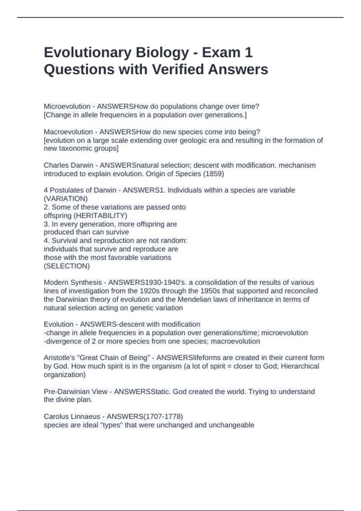 Evolutionary Biology - Exam 1 Questions with Verified Answers