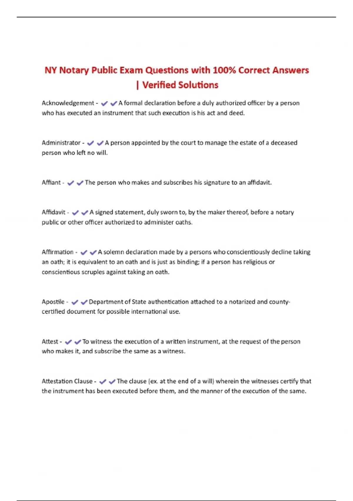 NY Notary Public Exam Questions with 100% Correct Answers | Verified Solutions