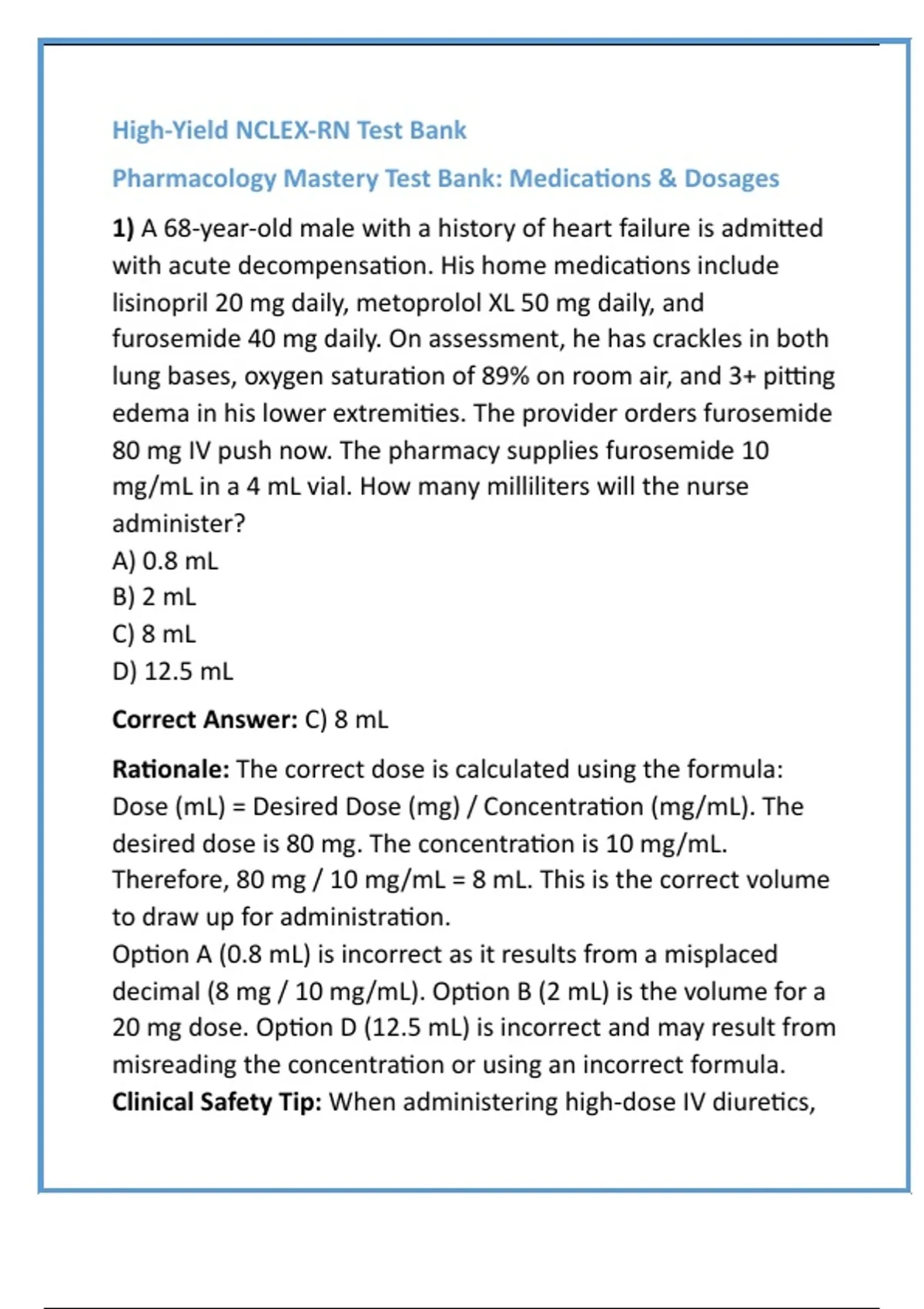 : This test bank concentrates on core pharmacological principles and safe medication use. It covers medication administration (five rights, error prevention), dose calculations, and key drug classes. Included content spans autonomic/cardiovascular agents, antibiotics, analgesics, psychotropic and neurologic drugs, respiratory therapies, endocrine and GI medications, and fluid/electrolyte . In practice, this means questions on drug side effects, interactions, IV infusions, and dosage math. Subtopics: • Medication Safety & Administration: Five rights, adverse effects, antidotes. • Dosage Calculations: Weight-based dosing, IV flow rates, pediatric dosing. • Cardiovascular Drugs: Anti-hypertensives, antianginals, inotropes. • Anti-Infectives: Antibiotics, antivirals, antifungals (dosing and monitoring). • CNS & Pain/Psych Meds: Analgesics (opioids, NSAIDs), anticonvulsants, antidepressants, antipsychotics. • Endocrine & GI Agents: Insulins and oral hypoglycemics, thyroid medications, GI acid reducers. • Respiratory Therapies: Bronchodilators, corticosteroids, and oxygen delivery. Rationale: Pharmacology is a heavily weighted NCLEX category (12–18% of questions). Mastery of medication management is critical for safe patient care. An NCLEX test bank in this area gives students targeted practice with high-yield drug facts and calculations. By drilling med administration scenarios and drug-class side effects (e.g. cardiac meds, antibiotics, analgesics), students build the competence needed for the Pharmacological & Parenteral Therapies section of the NCLEX #NCLEX #Pharmacology #NursingExamPrep #MedicationSafety #DoseCalculations #ClinicalVignettes #NursingStudents #Stuvia #OpioidSafety #IVInfusion • NCLEX pharmacology test bank • ,nursing medication safety questions • dose calculation practice questions • IV infusion calculation nursing • pediatric drug dosing practice • NCLEX RN pharmacology bank • opioid naloxone clinical scenario • vancomycin trough practice questions