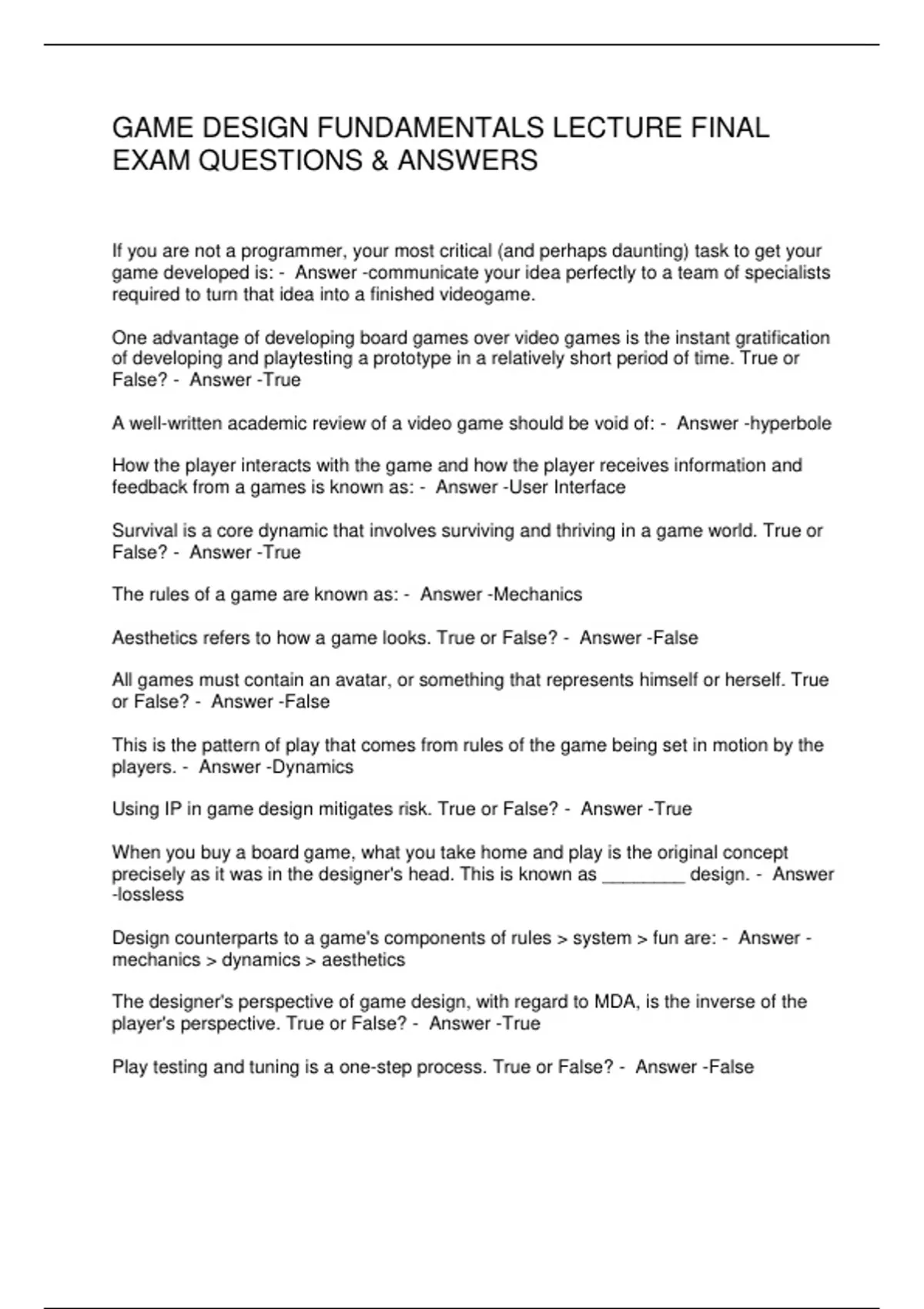 Aesthetics refers to how a game looks. True or False? - Answer -False