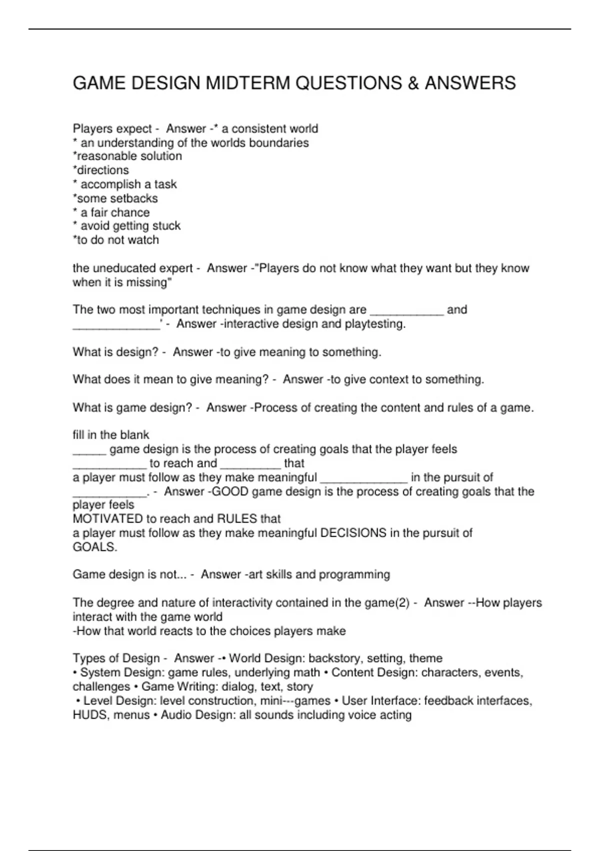 GAME DESIGN MIDTERM QUESTIONS & ANSWERS
