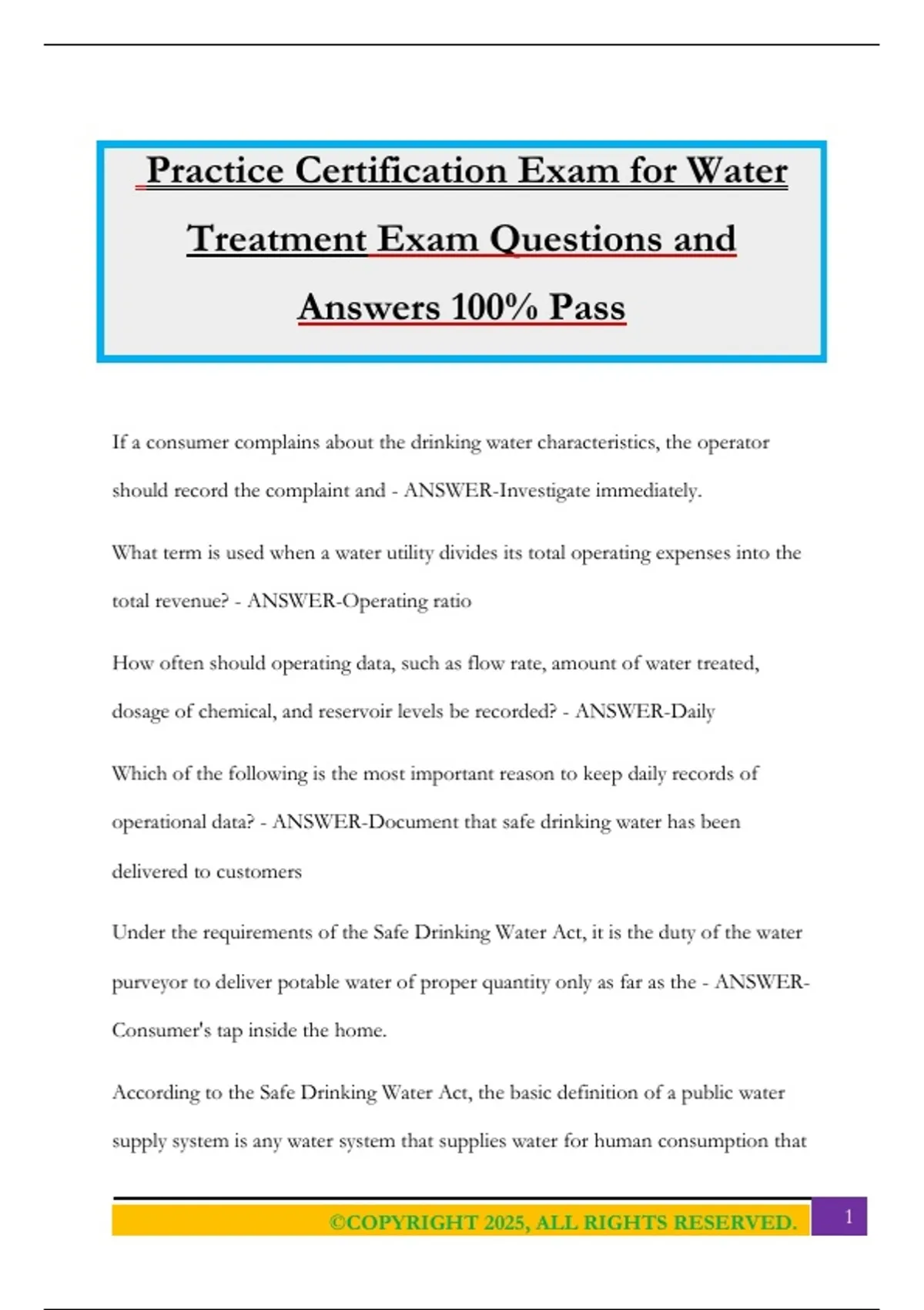 Practice Certification Exam for Water Treatment Exam Questions and Answers 100% Pass