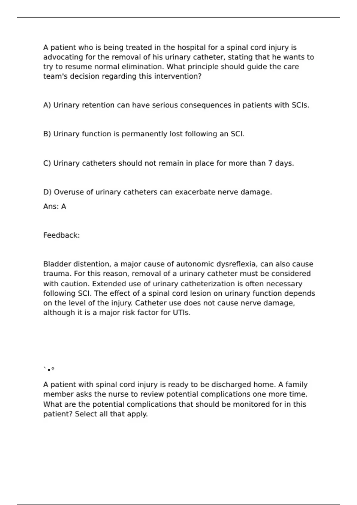 The nurse recognizes that a patient with a SCI is at risk for muscle spasticity.