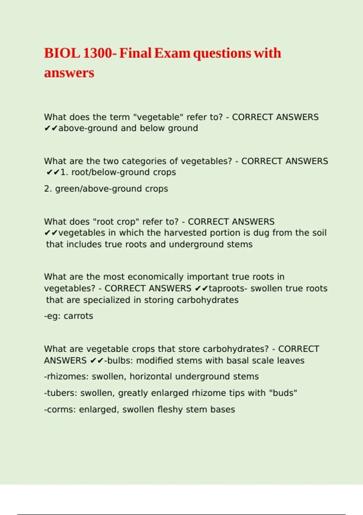 ,What are "green" vegetable crops? - CORRECT ANSWERS ✔✔all
