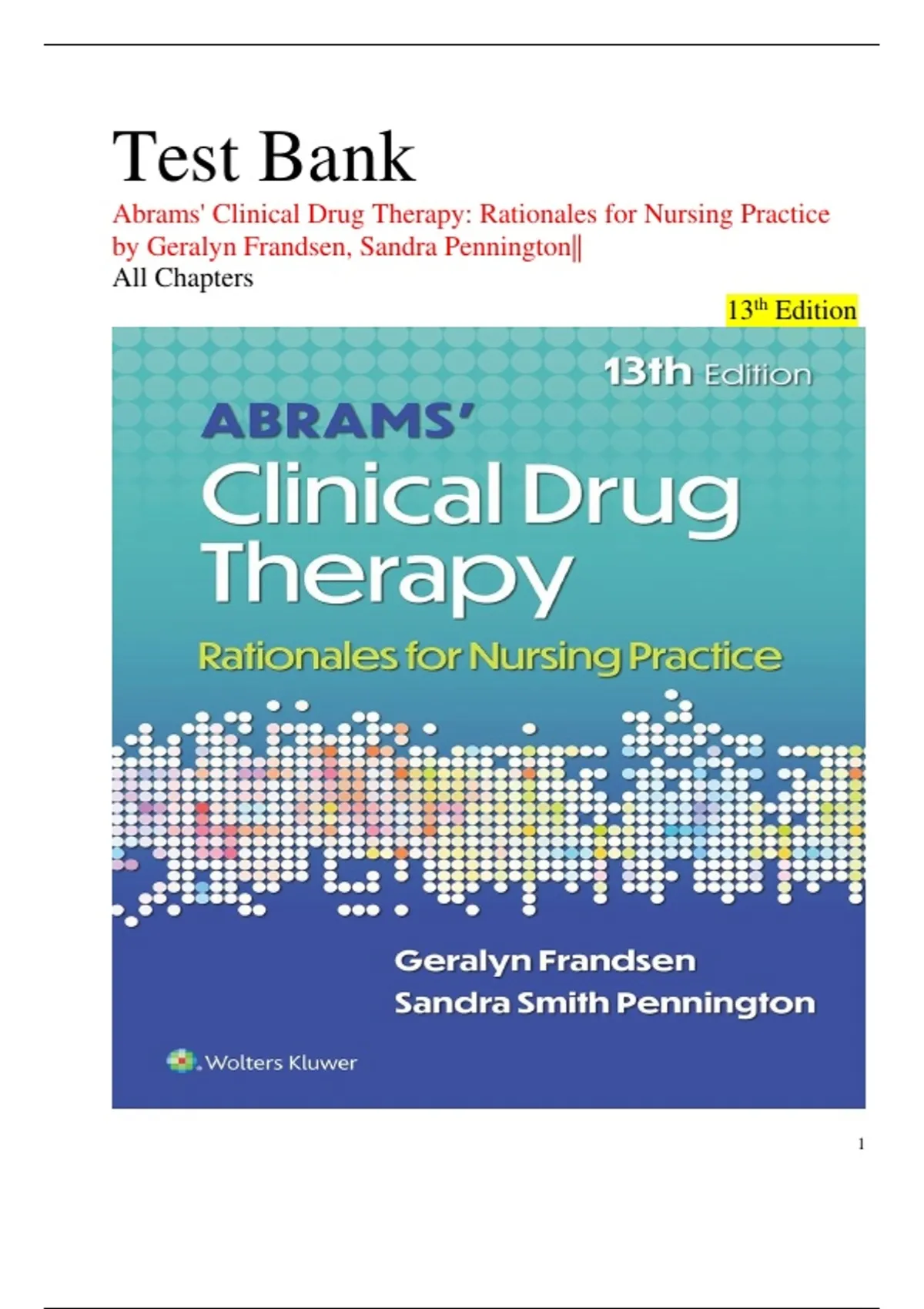 This document is a complete test bank for Abrams’ Clinical Drug Therapy: Rationales for Nursing Practice (13th Edition). It includes multiple-choice questions with rationales, answers, and references, organized by chapter. Topics span the foundation of pharmacology, safe medication administration, drug therapy across the lifespan, and drugs affecting major body systems including cardiovascular, respiratory, endocrine, renal, nervous, hematopoietic, and immune systems. This resource is designed to support nursing students with exam preparation, critical thinking practice, and mastery of pharmacology concepts.