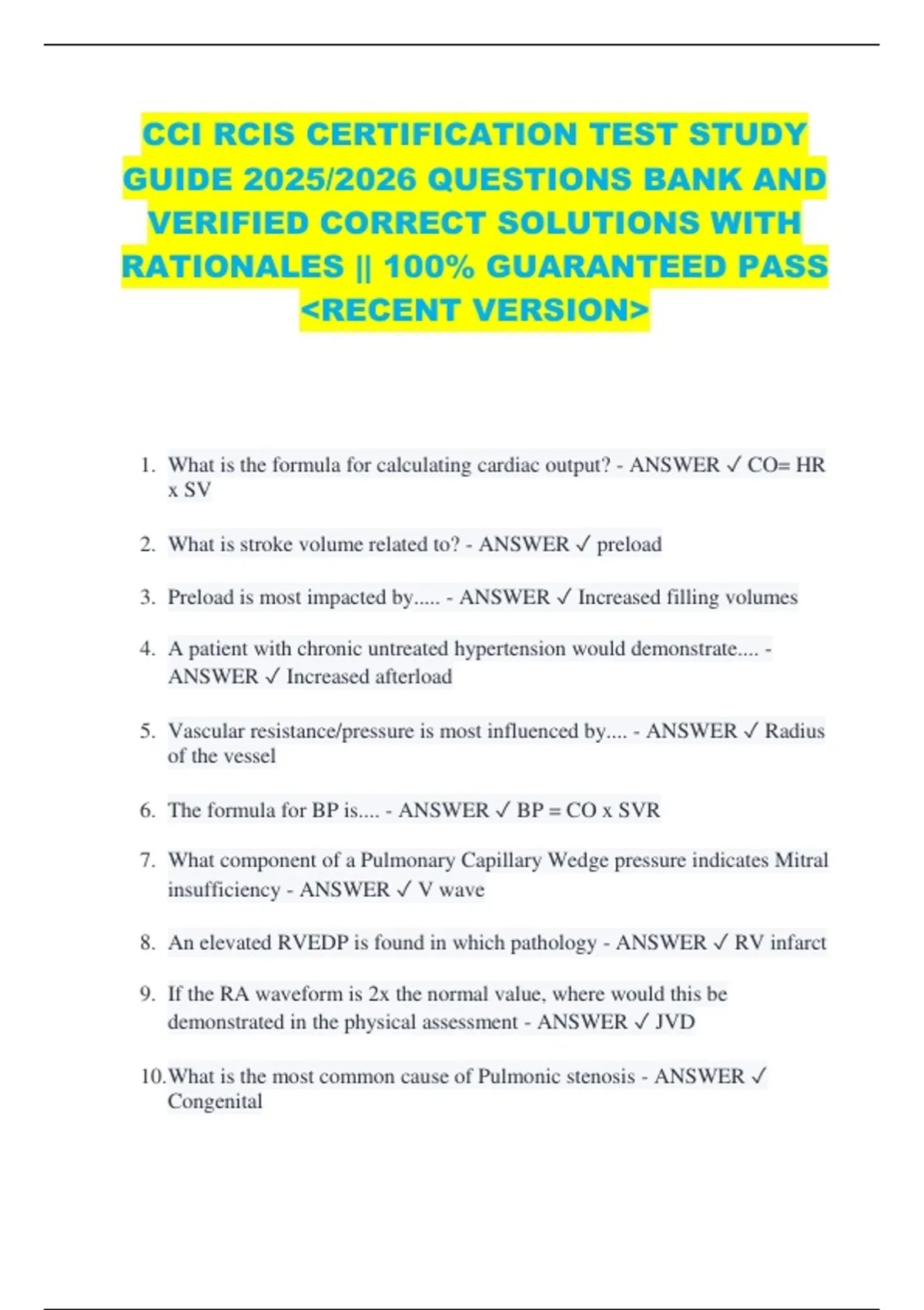 CCI RCIS CERTIFICATION TEST STUDY GUIDE 2025/2026 QUESTIONS BANK AND VERIFIED CORRECT SOLUTIONS WITH RATIONALES || 100% GUARANTEED PASS &lt;RECENT VERSION&gt; 1. What is the formula for calculating cardiac output? - ANSWER CO= HR x SV 2. What is stroke volume related to? - ANSWER preload 3. Preload is most impacted by..... - ANSWER Increased filling volumes 4. A patient with chronic untreated hypertension would demonstrate.... - ANSWER Increased afterload 5. Vascular resistance/pressure is most influenced by.... - ANSWER Radius of the vessel 6. The formula for BP is.... - ANSWER BP = CO x SVR 7. What component of a Pulmonary Capillary Wedge pressure indicates Mitral insufficiency - ANSWER V wave 8. An elevated RVEDP is found in which pathology - ANSWER RV infarct 9. If the RA waveform is 2x the normal value, where would this be demonstrated in the physical assessment - ANSWER JVD 10. What is the most common cause of Pulmonic stenosis - ANSWER Congenital 11. The Blue proximal part of the swan is located how far from the distal tip of the swan - ANSWER 30 cm 12. When performing a thermodilution cardiac output, the operator injects 10 cc of saline into the _____ and the temperature change is measured in the ______ - ANSWER RA, PA 13. Equalization of RVEDP and LVEDP are found in - ANSWER restrictive pericarditis 14. Signs of Right sided heart failure include - ANSWER JVD 15. Based on these oxygen saturations, what type of shunt is present? SVC sat= 67% IVC sat= 71% RA sat= 85% RV sat= 85% PA sat= 85% LA sat= 98% LV sat= 98% AO sat= 98% - ANSWER L to R ASD 16. What type of ASD, located in the middle 1/3 of the atrial septum (the former site of the fossa ovalis) is called - ANSWER Ostium Secundum 17. What is the Flamm's equation - ANSWER 3(SVC) + 1(IVC)/4 18. The formula used to calculate MAP is - ANSWER 1 (systolic) + 2 (diastolic)/3 19. A common complication of a Rotoblador is - ANSWER Distal embolization 1. When intervening in the mid/distal right leg from a radial approach, which is the best wire choice? - ANSWER .035 x 260 2. Which of the following BEST describes a balloon's ability to yield to changes in pressure? - ANSWER Compliance 3. What is the PRIMARY therapeutic reason for using rotational atherectomy as an adjunctive therapy for PCI? - ANSWER To remove calcific atherosclerotic plaque 4. A Forgarty balloon is commonly used ______ - ANSWER for removing clot from vein/artery 5. Select the methods used to treat flow limiting dissections - ANSWER stent, covered stent, angioplasty 6. When using a rotational atherectomy device in the RCA, what else should you consider using? - ANSWER Temporary pacing, catheter with side holes, (larger bur or vasodilators) 7. What information is required prior to prepping the patient for the procedure? - ANSWER patient identifiers, allergies, NPO status, advanced directives 8. Which of the following inotropic agents predominately stimulates beta 1 receptors? - ANSWER Dopamine 9. What is the desired hemodynamic effect of an intra-aortic balloon counterpulsation? - ANSWER Increased coronary bloodflow 10. What view exposes an operator standing on the patient's right side to the highest dose of radiation? - ANSWER LAO Cranial 11. Which actions should be completed when prepping the patient for a transradial cardiac catheterization? - ANSWER Allan's test, pre-sedation, local anesthetic, ultrasound, draping 21. What determines the number of electrons generated by an x-ray tube? - ANSWER Kilovoltage 22. What medication is cardiac glycoside? - ANSWER Digoxin (Lanoxin) 23. What type of arterial puncture is associated with an increased risk of retroperitoneal bleed? - ANSWER High common femoral 24. What are the contraindications for rotational atherectomy? - ANSWER Existing dissection, saphenous vein graft lesion, angiographic evidence of thrombus 25. What type of balloon catheter should be used to treat fibrotic plaque and neo-intimal hyperplasia? - ANSWER Scoring 26. What devices are used to treat flow limiting dissections? - ANSWER Stent, angioplasty 27. Peg hydrogel plug closure device - ANSWER Mynx 28. Suture mediated closure device - ANSWER Perclose 29. Collagen and suture mediated closure device - ANSWER Angioseal 30. What initial sign of retroperitoneal bleed may a patient exhibit? - ANSWER Hypotension, lower back pain, a falling hematocrit 31. What condition is associated with an elevated pulse pressure? - ANSWER Aortic insufficiency 32. What should be done to manage the rapid loss of balloon pressure during inflation? - ANSWER Inject the coronary before removing balloon 33. What type of imaging is most commonly used during PFO closures? - ANSWER ICE (intra-cardiac echo) 34. What is an advantage to using a filter versus a balloon occlusion distal protection device? - ANSWER allows distal perfusion