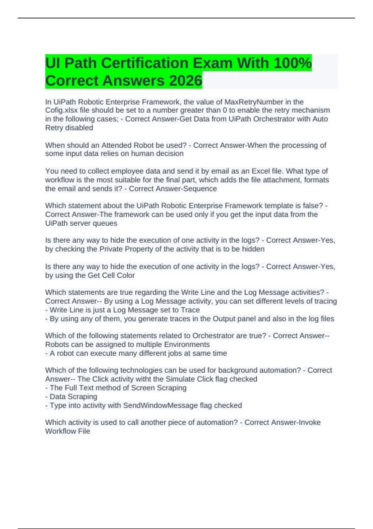 UI Path Certification Exam With 100% Correct Answers 2026 In UiPath Robotic Enterprise Framework, the value of MaxRetryNumber in the C file should be set to a number greater than 0 to enable the retry mechanism in the following cases; - Correct Answer-Get Data from UiPath Orchestrator with Auto Retry disabled When should an Attended Robot be used? - Correct Answer-When the processing of some input data relies on human decision You need to collect employee data and send it by email as an Excel file. What type of workflow is the most suitable for the final part, which adds the file attachment, formats the email and sends it? - Correct Answer-Sequence Which statement about the UiPath Robotic Enterprise Framework template is false? - Correct Answer-The framework can be used only if you get the input data from the UiPath server queues Is there any way to hide the execution of one activity in the logs? - Correct Answer-Yes, by checking the Private Property of the activity that is to be hidden Is there any way to hide the execution of one activity in the logs? - Correct Answer-Yes, by using the Get Cell Color Which statements are true regarding the Write Line and the Log Message activities? - Correct Answer-- By using a Log Message activity, you can set different levels of tracing - Write Line is just a Log Message set to Trace - By using any of them, you generate traces in the Output panel and also in the log files Which of the following statements related to Orchestrator are true? - Correct Answer-- Robots can be assigned to multiple Environments - A robot can execute many different jobs at same time Which of the following technologies can be used for background automation? - Correct Answer-- The Click activity witht the Simulate Click flag checked - The Full Text method of Screen Scraping - Data Scraping - Type into activity with SendWindowMessage flag checked Which activity is used to call another piece of automation? - Correct Answer-Invoke Workflow File