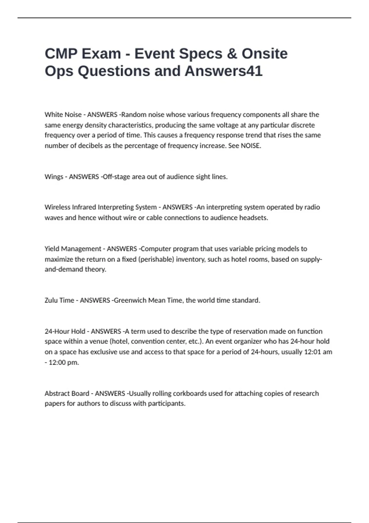 CMP Exam - Event Specs & Onsite Ops Questions and Answers White Noise - ANSWERS -Random noise whose various frequency components all share the same energy density characteristics, producing the same voltage at any particular discrete frequency over a period of time. This causes a frequency response trend that rises the same number of decibels as the percentage of frequency increase. See NOISE. Wings - ANSWERS -Off-stage area out of audience sight lines. Wireless Infrared Interpreting System - ANSWERS -An interpreting system operated by radio waves and hence without wire or cable connections to audience headsets. Yield Management - ANSWERS -Computer program that uses variable pricing models to maximize the return on a fixed (perishable) inventory, such as hotel rooms, based on supply-and-demand theory. Zulu Time - ANSWERS -Greenwich Mean Time, the world time standard. 24-Hour Hold - ANSWERS -A term used to describe the type of reservation made on function space within a venue (hotel, convention center, etc.). An event organizer who has 24-hour hold on a space has exclusive use and access to that space for a period of 24-hours, usually 12:01 am - 12:00 pm. Abstract Board - ANSWERS -Usually rolling corkboards used for attaching copies of research papers for authors to discuss with participants.