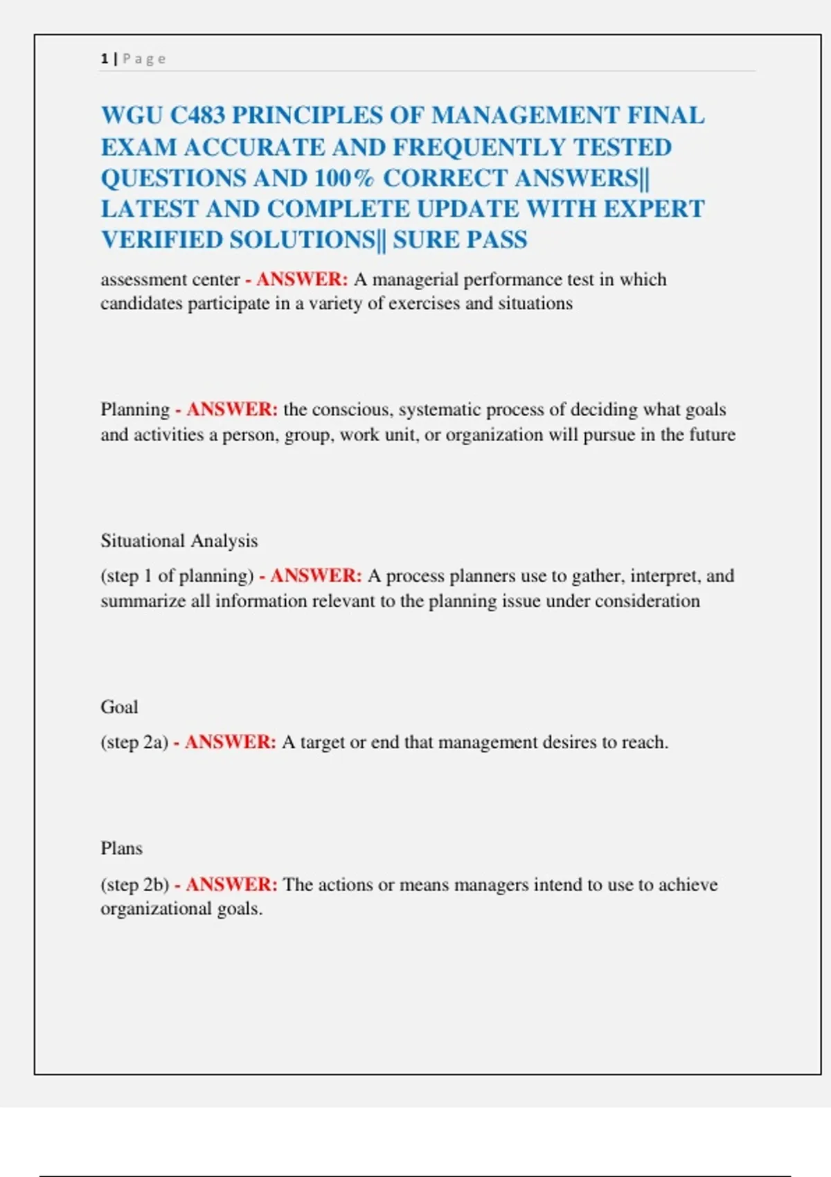 WGU C483 PRINCIPLES OF MANAGEMENT FINAL EXAM ACCURATE AND FREQUENTLY TESTED QUESTIONS AND 100% CORRECT ANSWERS|| LATEST AND COMPLETE UPDATE WITH EXPERT VERIFIED SOLUTIONS|| SURE PASS