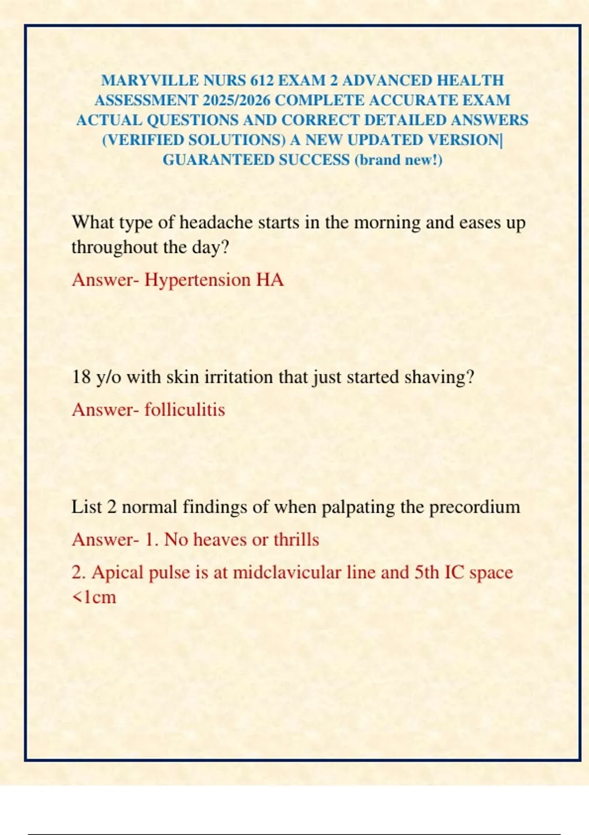 MARYVILLE NURS 612 EXAM 2 ADVANCED HEALTH ASSESSMENT 2025/2026 COMPLETE ACCURATE EXAM ACTUAL QUESTIONS AND CORRECT DETAILED ANSWERS (VERIFIED SOLUTIONS) A NEW UPDATED VERSION| GUARANTEED SUCCESS (brand new!)