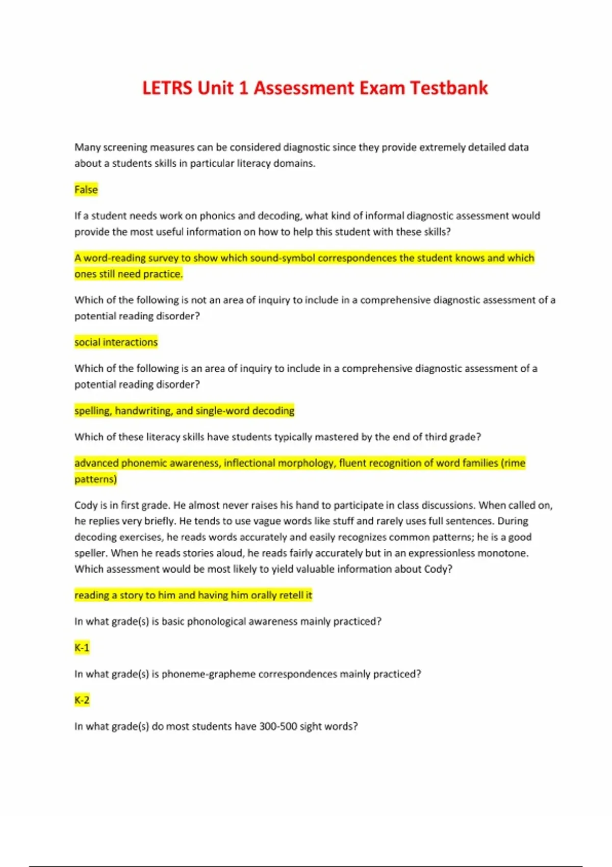 TEST BANK FOR LETRS UNIT 1 ASSESSMENT EXAM. QUESTIONS AND ANSWERS