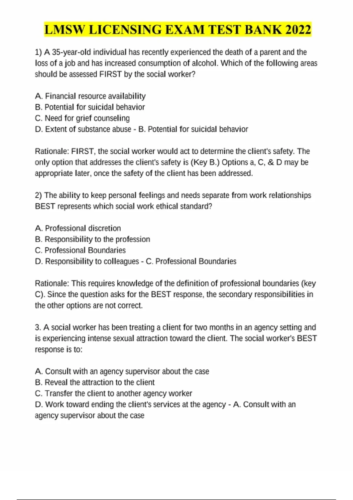TEST BANK FOR LMSW LICENSING EXAM. QUESTIONS AND ANSWERS