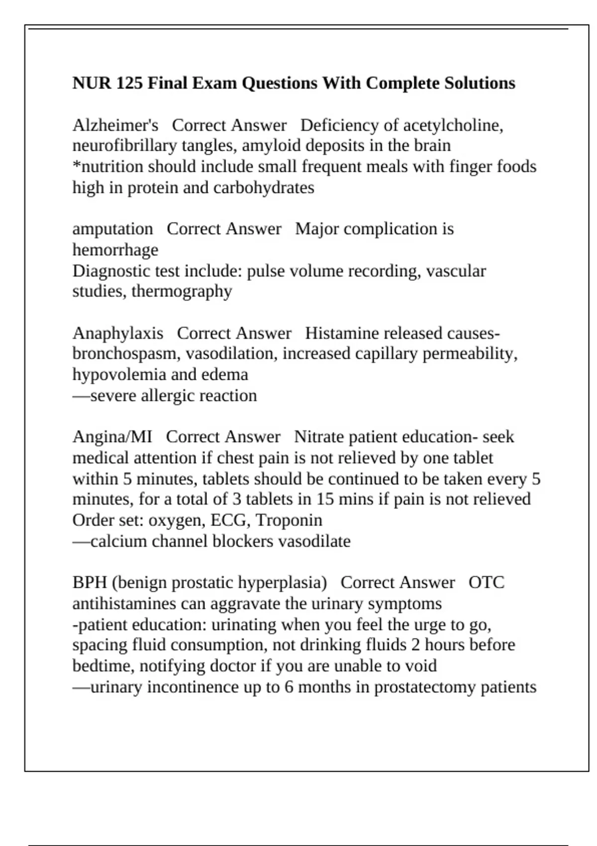 NUR 125 Final Exam Questions With Complete Solutions
