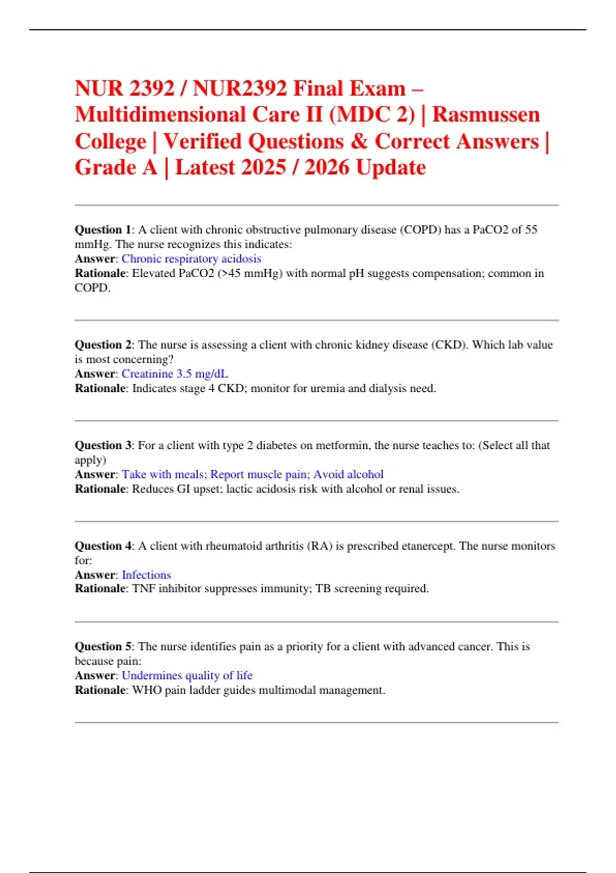 This document is an actual exam prep resource for the NUR 2392 / NUR2392 Multidimensional Care II (MDC 2) Final Exam at Rasmussen College. It provides verified exam questions with 100% correct answers, fully updated for the 2025 / 2026 academic cycle. The material covers actual exam topics including complex patient care, chronic and acute conditions, pharmacology, nursing interventions, and clinical decision-making. With this guide, nursing students can review actual exam-style questions and prepare effectively to achieve a Grade A result.