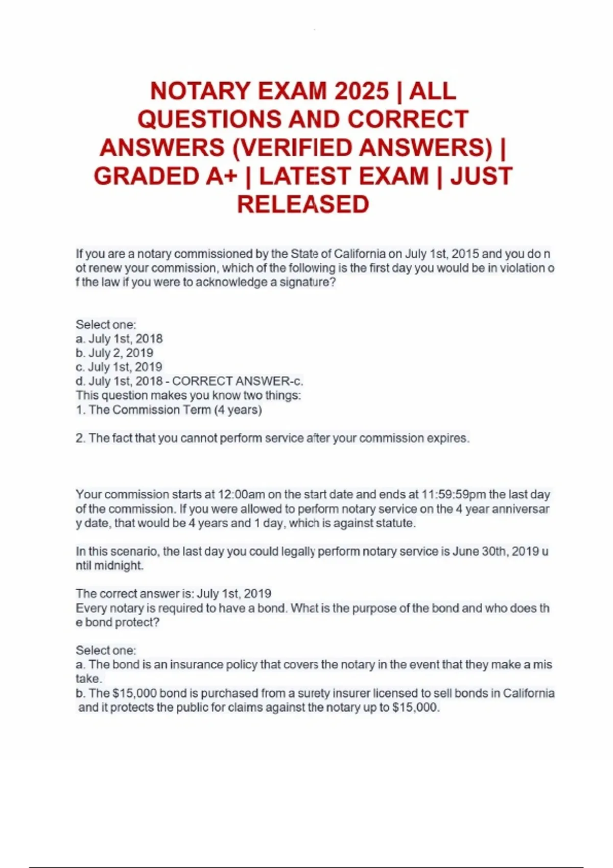 NOTARY EXAM 2025 | ALL QUESTIONS AND CORRECT ANSWERS (VERIFIED ANSWERS) | GRADED A+ | LATEST EXAM | JUST RELEASED IfJyouJareJaJnotaryJcommissionedJbyJtheJStateJofJCaliforniaJonJJulyJ1st,J2015JandJyouJdoJn otJrenewJyourJcommission,JwhichJofJtheJfollowingJisJtheJfirstJdayJyouJwouldJbeJinJviolationJo fJ theJlawJifJyouJwereJtoJacknowledgeJaJsignature? SelectJone: a.JJulyJ1st,J2018 b.JJulyJ2,J2019 c.JJulyJ1st,J2019J d.JJulyJ1st,J2018J-JCORRECTJANSWER-c. ThisJquestionJmakesJyouJknowJtwoJthings: 1.JTheJCommissionJTermJ(4Jyears) 2.JTheJfactJthatJyouJcannotJperformJserviceJafterJyourJcommissionJexpires. YourJcommissionJstartsJatJ12:00amJonJtheJstartJdateJandJendsJatJ11:59:59pmJtheJlastJdayJ ofJtheJcommission.JIfJyouJwereJallowedJtoJperformJnotaryJserviceJonJtheJ4JyearJanniversar yJdate,JthatJwouldJbeJ4JyearsJandJ1Jday,JwhichJisJagainstJstatute. InJthisJscenario,JtheJlastJdayJyouJcouldJlegallyJperformJnotaryJserviceJisJJuneJ30th,J2019Ju ntilJmidnight. TheJcorrectJanswerJis:JJulyJ1st,J2019 EveryJnotaryJisJrequiredJtoJhaveJaJbond.JWhatJisJtheJpurposeJofJtheJbondJandJwhoJdoesJth eJbondJprotect? SelectJone: a.JTheJbondJisJanJinsuranceJpolicyJthatJcoversJtheJnotaryJinJtheJeventJthatJtheyJmakeJaJmis take.J b.JTheJ$15,000JbondJisJpurchasedJfromJaJsuretyJinsurerJlicensedJtoJsellJbondsJinJCalifornia JandJitJprotectsJtheJpublicJforJclaimsJagainstJtheJnotaryJupJtoJ$15,000