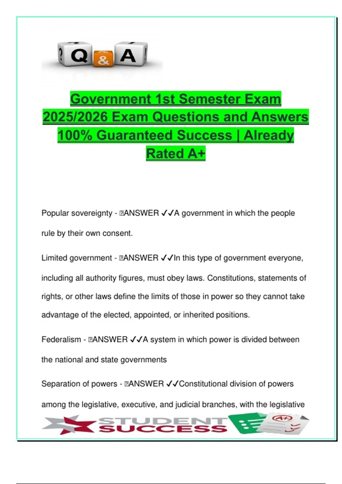 Popular sovereignty - 🧠ANSWER ✔✔A government in which the people