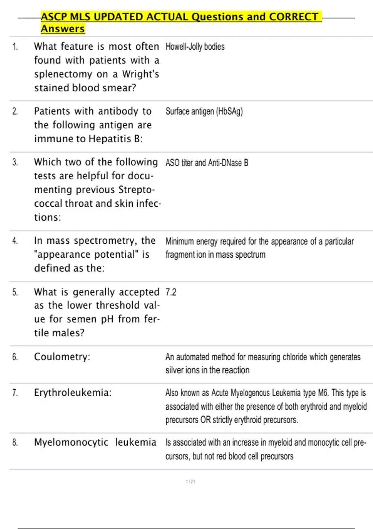 , ASCP MLS UPDATED ACTUAL Questions and CORRECT