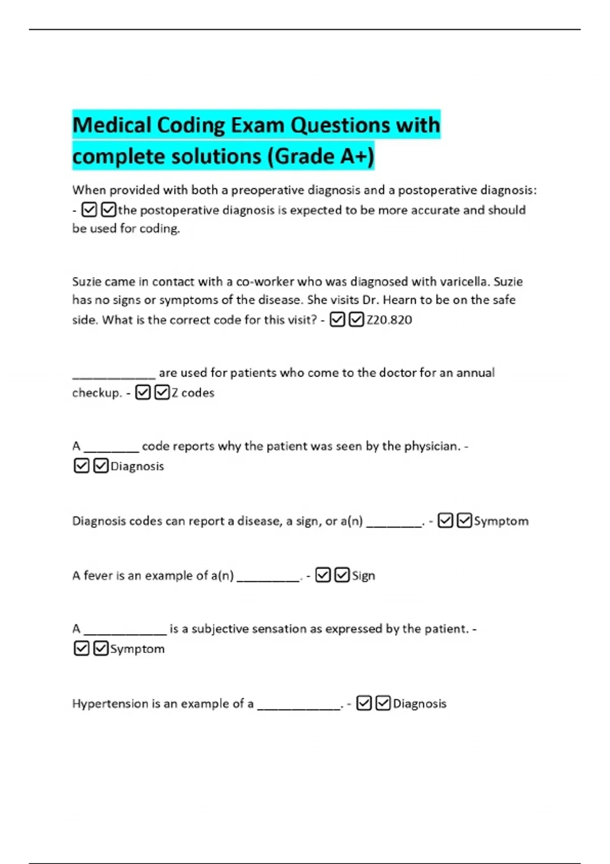 Medical Coding Exam Questions with complete solutions (Grade A+) When provided with both a preoperative diagnosis and a postoperative diagnosis: - the postoperative diagnosis is expected to be more accurate and should be used for coding. Suzie came in contact with a co-worker who was diagnosed with varicella. Suzie has no signs or symptoms of the disease. She visits Dr. Hearn to be on the safe side. What is the correct code for this visit? - Z20.820 ____________ are used for patients who come to the doctor for an annual checkup. - Z codes