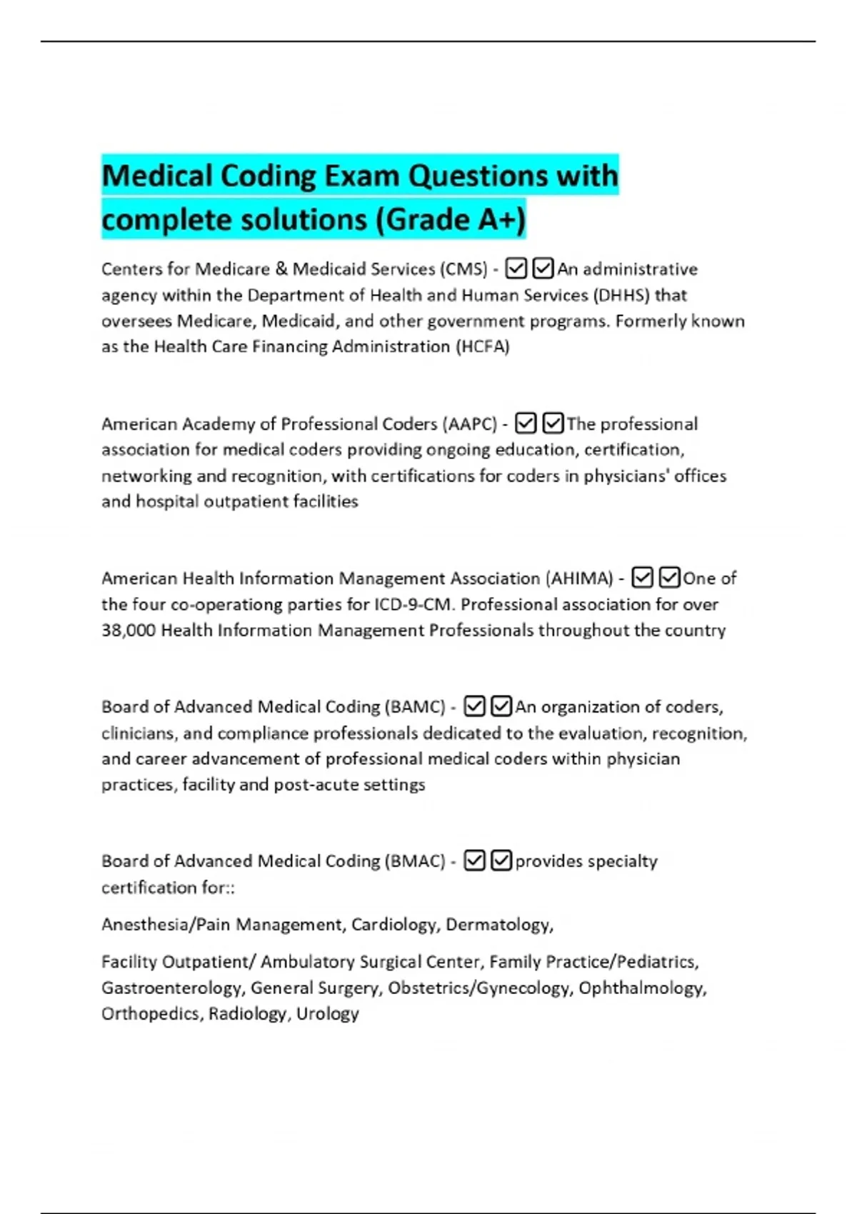 Medical Coding Exam Questions with complete solutions (Grade A+) Centers for Medicare & Medicaid Services (CMS) - An administrative agency within the Department of Health and Human Services (DHHS) that oversees Medicare, Medicaid, and other government programs. Formerly known as the Health Care Financing Administration (HCFA) American Academy of Professional Coders (AAPC) - The professional association for medical coders providing ongoing education, certification, networking and recognition, with certifications for coders in physicians' offices and hospital outpatient facilities