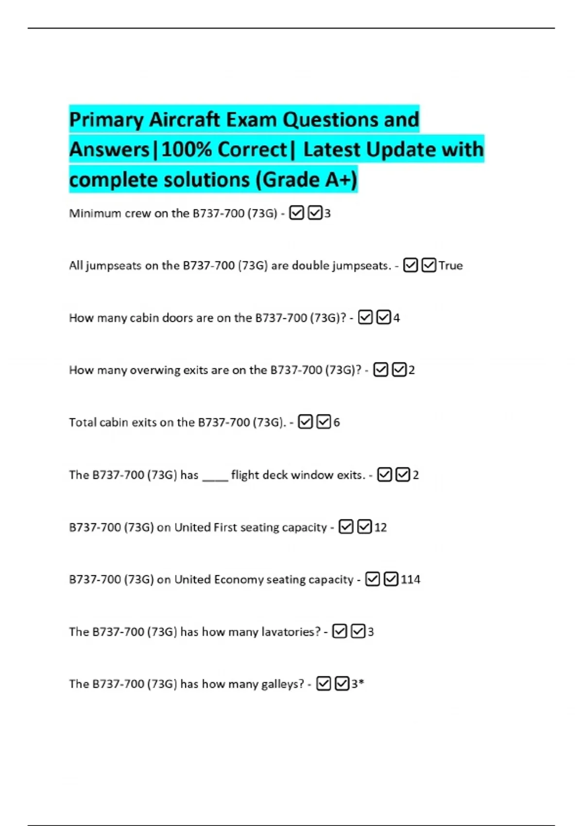 Primary Aircraft Exam Questions and Answers|100% Correct| Latest Update with complete solutions (Grade A+) Minimum crew on the B737-700 (73G) - 3 All jumpseats on the B737-700 (73G) are double jumpseats. - True How many cabin doors are on the B737-700 (73G)? - 4 How many overwing exits are on the B737-700 (73G)? - 2 Total cabin exits on the B737-700 (73G). - 6