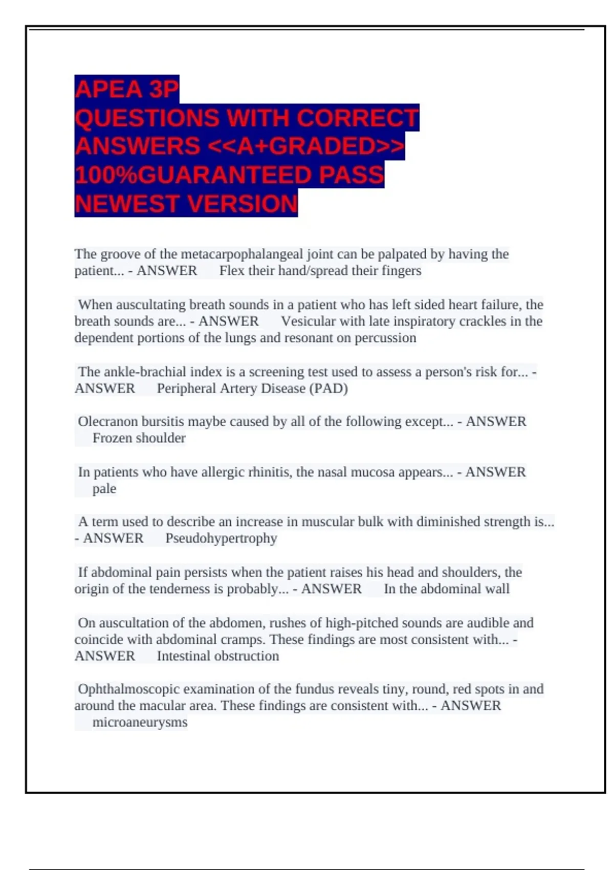 APEA 3P Exam OBJECTIVE ASSESMENT EXAM LATEST WAVEA+GRADEDUPDATED SYLLABUS 100% GUARANTEED PASS