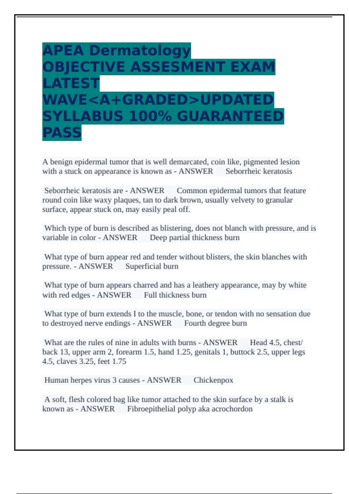 APEA Dermatology OBJECTIVE ASSESMENT EXAM LATEST WAVEA+GRADEDUPDATED SYLLABUS 100% GUARANTEED PASS A benign epidermal tumor that is well demarcated, coin like, pigmented lesion with a stuck on appearance is known as - ANSWER Seborrheic keratosis Seborrheic keratosis are - ANSWER Common epidermal tumors that feature round coin like waxy plaques, tan to dark brown, usually velvety to granular surface, appear stuck on, may easily peal off. Which type of burn is described as blistering, does not blanch with pressure, and is variable in color - ANSWER Deep partial thickness burn What type of burn appear red and tender without blisters, the skin blanches with pressure. - ANSWER Superficial burn What type of burn appears charred and has a leathery appearance, may by white with red edges - ANSWER Full thickness burn What type of burn extends I to the muscle, bone, or tendon with no sensation due to destroyed nerve endings - ANSWER Fourth degree burn What are the rules of nine in adults with burns - ANSWER Head 4.5, chest/ back 13, upper arm 2, forearm 1.5, hand 1.25, genitals 1, buttock 2.5, upper legs 4.5, claves 3.25, feet 1.75 Human herpes virus 3 causes - ANSWER Chickenpox A soft, flesh colored bag like tumor attached to the skin surface by a stalk is known as - ANSWER Fibroepithelial polyp aka acrochordon