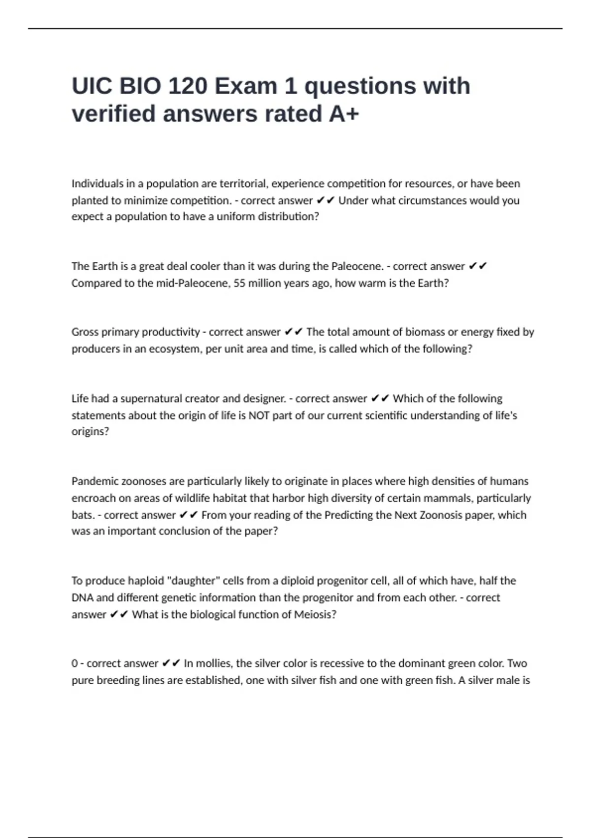UIC BIO 120 Exam 1 questions with verified answers rated A+