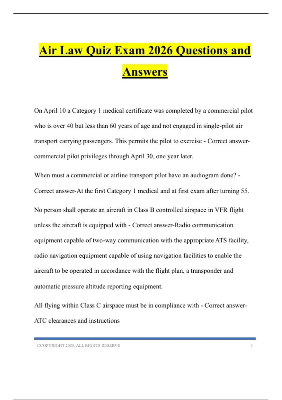 Air Law Quiz Exam 2026 Questions and Answers