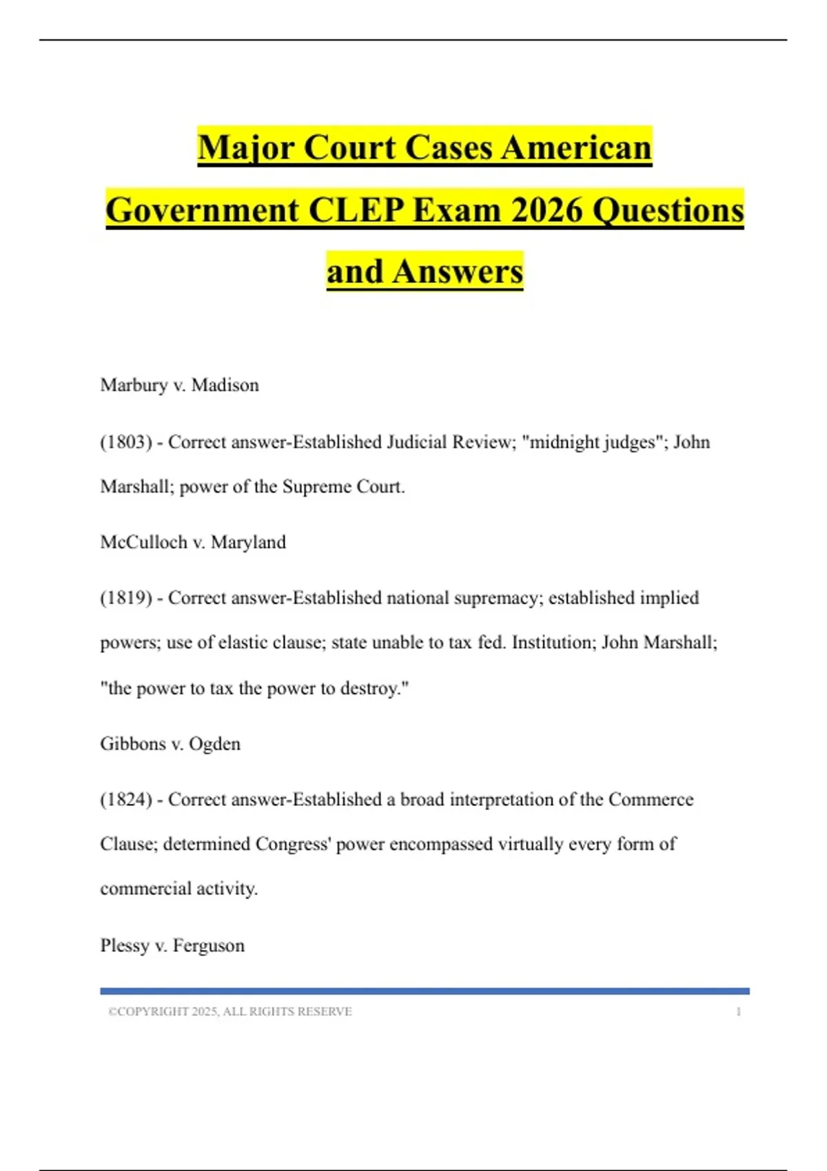 Major Court Cases American Government CLEP Exam 2026 Questions and Answers