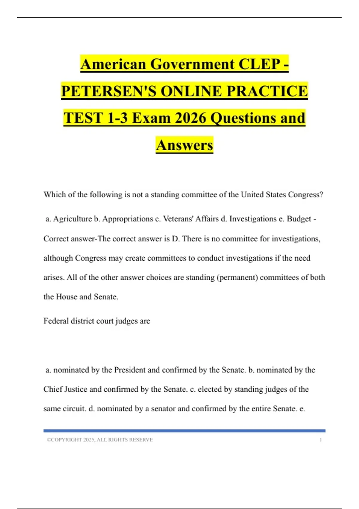 American Government CLEP - PETERSEN'S ONLINE PRACTICE TEST 1-3 Exam 2026 Questions and Answers