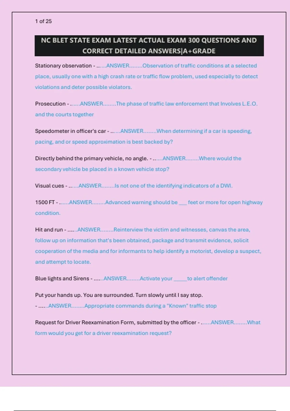 Prepare for the North Carolina Basic Law Enforcement Training (BLET) State Exam with this comprehensive study resource. This guide includes 300 actual exam questions and detailed answers covering all key topics such as traffic enforcement, criminal investigation, emergency response, legal procedures, ethics, and more. Whether you're a recruit or a seasoned officer seeking recertification, this material is designed to help you achieve an A+ grade and excel on the exam. Ideal for self-study, review sessions, and last-minute prep.