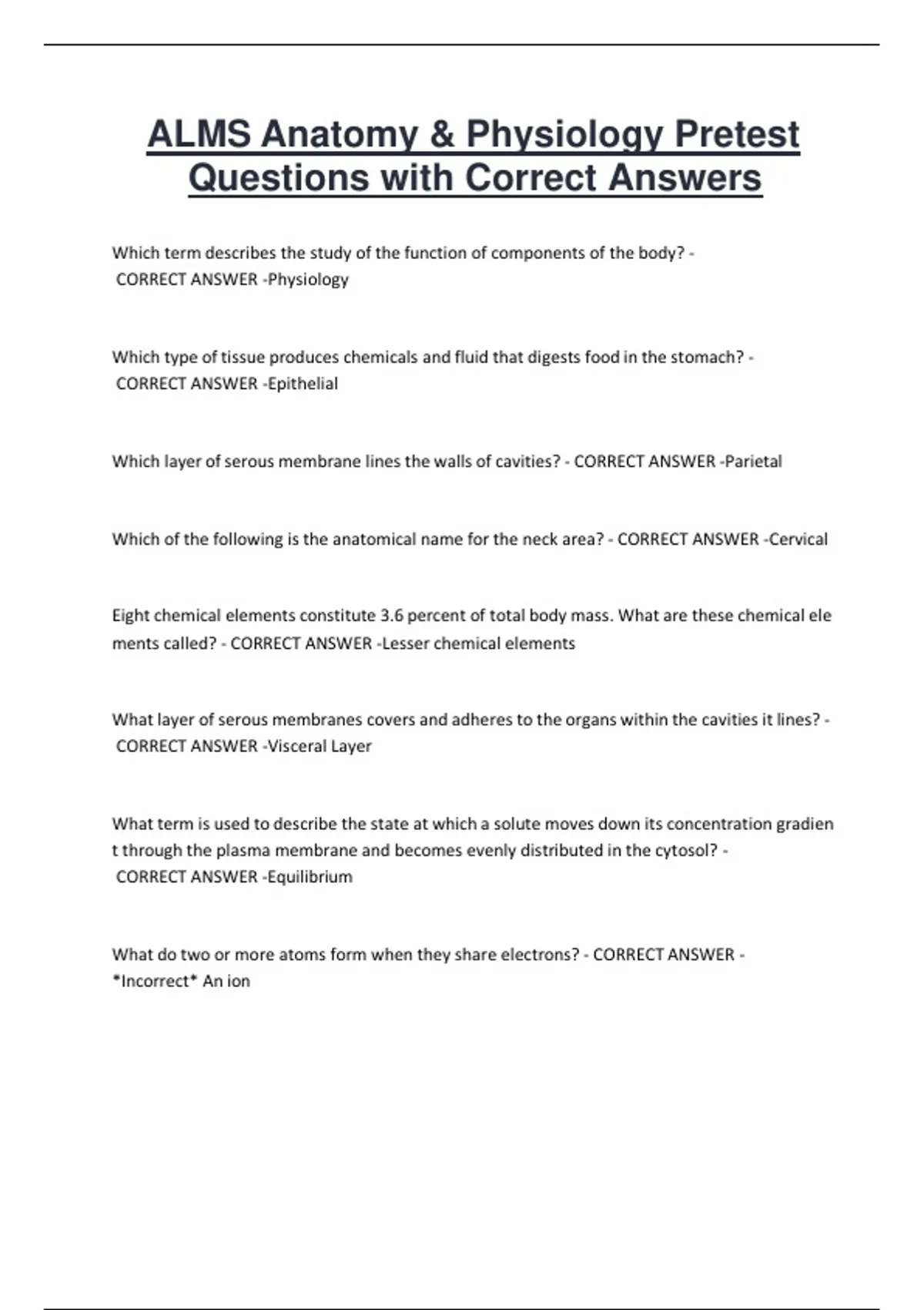 ALMS Anatomy & Physiology Pretest Questions with Correct Answers