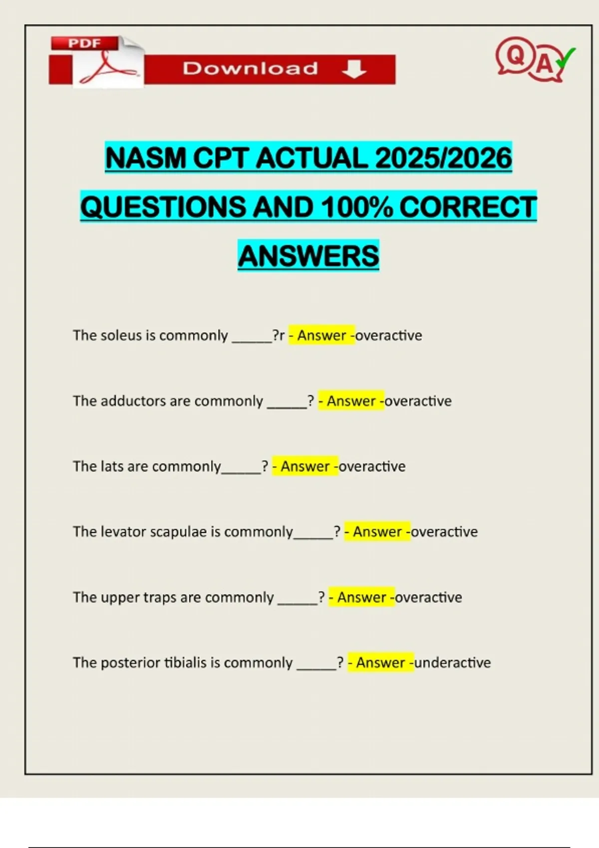 NASM CPT ACTUAL 2025/2026 QUESTIONS AND 100% CORRECT ANSWERS The soleus is commonly _____?r - Answer -overactive The adductors are commonly _____? - Answer -overactive The lats are commonly_____? - Answer -overactive The levator scapulae is commonly_____? - Answer -overactive The upper traps are commonly _____? - Answer -overactive The posterior tibialis is commonly _____? - Answer -underactiveNeed assistance on Online classes, Exams & Assignments? Reach out for instant help!! Full Course Assistance, Plagiarism-free Essay Writing, Research Paper, Dissertation, Discussion Posts, etc…. Confidential & Secure services. Tutors are available for all subjects! Email now at: The medial gastrocnemius is commonly _____? - Answer -underactive the VMO is commonly _____? - Answer -underactive The gluteus maximus is commonly _____? - Answer -underactive The deep cervical flexors are commonly_____? - Answer -underactive The rhomboids are commonly _____? - Answer -underactive Frontal plane motion occurs around an _____ axis? - Answer -anterior posterior Shoulder elevation refers to the _____ motion of the scapula. - Answer - Superior system in charge of motor control - Answer -nervous systemsystem in charge of motor learning - Answer -nervous system system containing mechanoreceptors - Answer -nervous system system that creates energy - Answer -muscular system system in charge of blood production - Answer -skeletal system 3 systems of the kinetic chain - Answer -nervous, muscular, skeleta