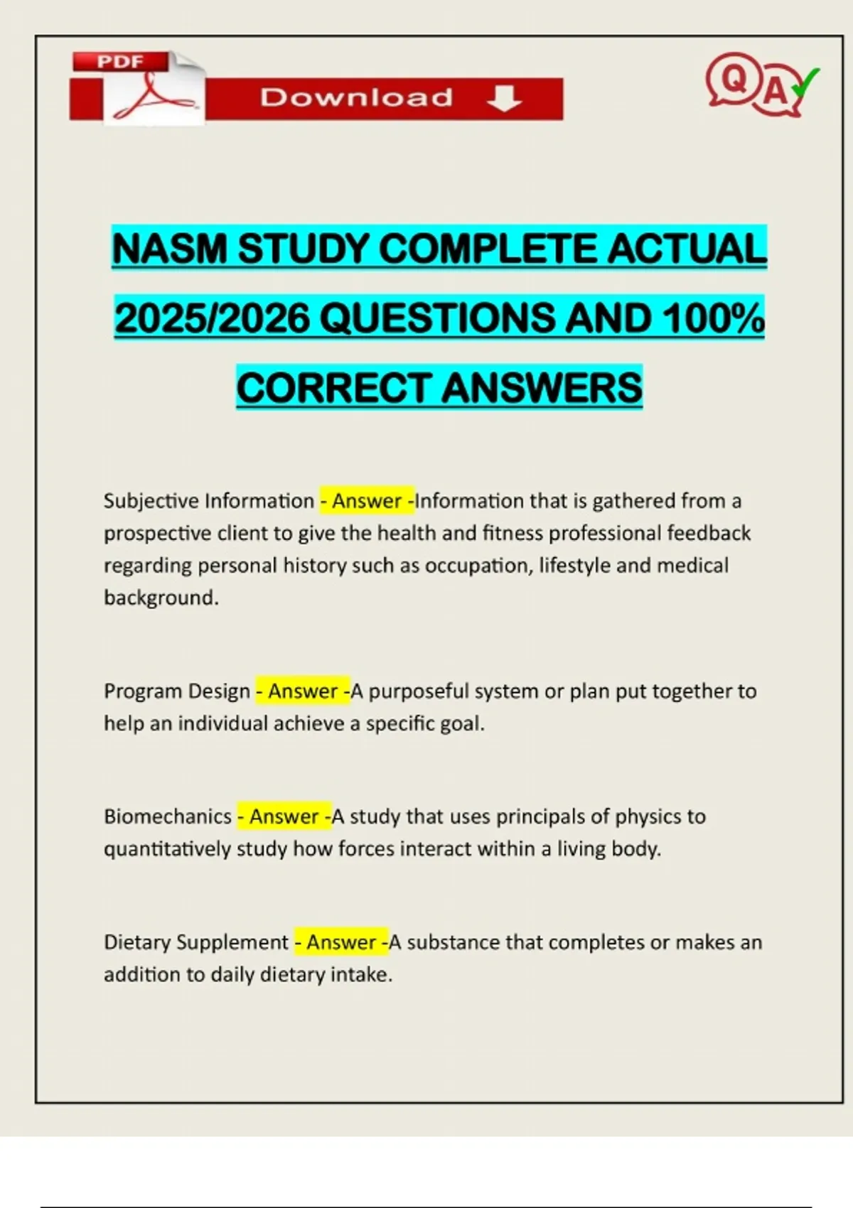 NASM STUDY COMPLETE ACTUAL 2025/2026 QUESTIONS AND 100% CORRECT ANSWERS Subjective Information - Answer -Information that is gathered from a prospective client to give the health and fitness professional feedback regarding personal history such as occupation, lifestyle and medical background. Program Design - Answer -A purposeful system or plan put together to help an individual achieve a specific goal. Biomechanics - Answer -A study that uses principals of physics to quantitatively study how forces interact within a living body. Dietary Supplement - Answer -A substance that completes or makes an addition to daily dietary intake.Need assistance on Online classes, Exams & Assignments? Reach out for instant help!! Full Course Assistance, Plagiarism-free Essay Writing, Research Paper, Dissertation, Discussion Posts, etc…. Confidential & Secure services. Tutors are available for all subjects! Email now at: Proprioceptively enriched environment - Answer -An unstable (but controlled) environment where exercises are performed that causes the body to use its internal balance and stabilization mechanisms Reactive Training - Answer -Exercises that use quick, powerful movements involving an eccentric contraction immediately followed by an explosive concentric contraction. Obesity - Answer -Fastest growing health problem in the US The Nervous System - Answer -It is a conglomeration of billions of cells forming nerves that are specifically designed to provide a communication network within the human body nervous system, skeletal system and muscular system - Answer -kinetic chain Heart - Answer -Muscular pump that rhythmically contracts to push blood throughout the bodyDynamic Joint Stabilization - Answer -The ability of the kinetic chain to stabilize a joint during movement. Speed - Answer -The ability to move the body in one intended direction as fast as possible. The Core - Answer -The lumbo-pelvic -hip complex and the thoracic and cervical spine, where the body's center of gravity is located Flexibility - Answer -The normal extensibility of all soft tissues that allow the full range of motion of a joint. Nutrition - Answer -The sum of the processes by which an anima