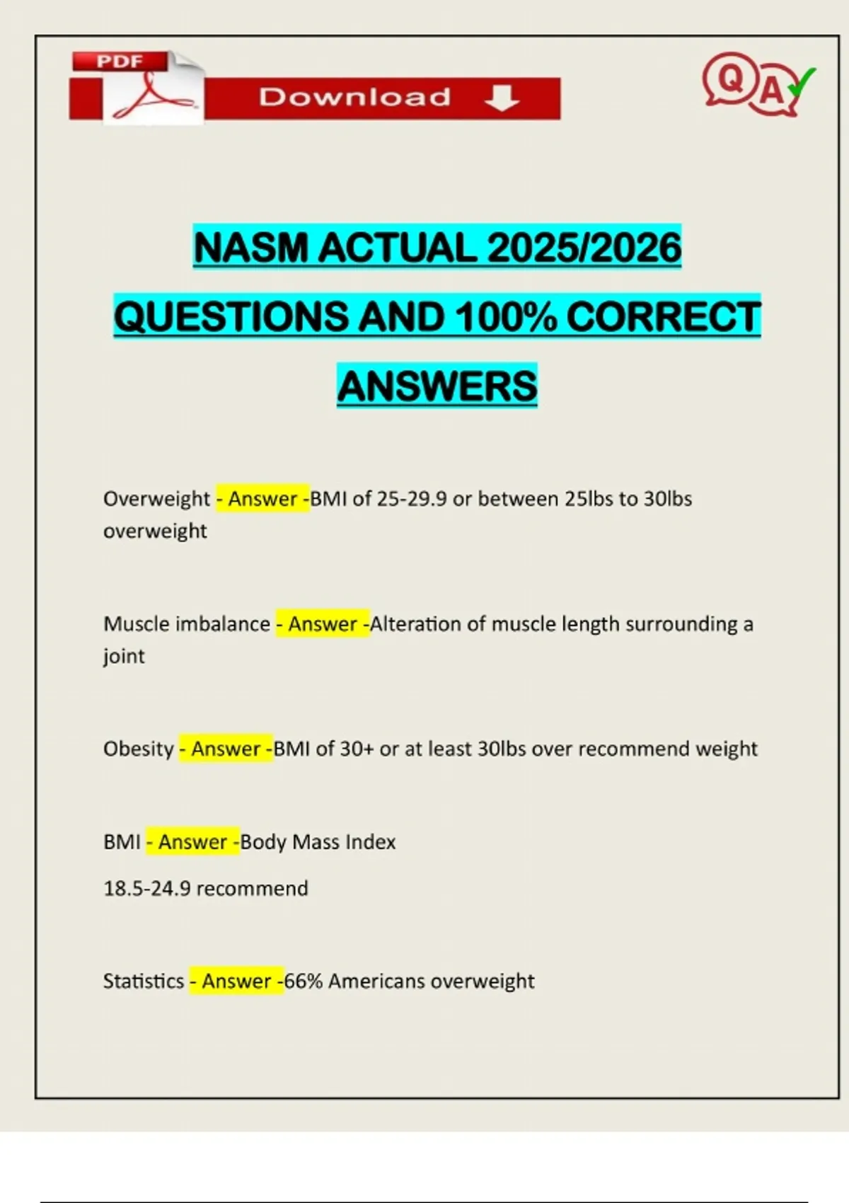 NASM ACTUAL 2025/2026 QUESTIONS AND 100% CORRECT ANSWERS Overweight - Answer -BMI of 25-29.9 or between 25lbs to 30lbs overweight Muscle imbalance - Answer -Alteration of muscle length surrounding a joint Obesity - Answer -BMI of 30+ or at least 30lbs over recommend weight BMI - Answer -Body Mass Index 18.5-24.9 recommend Statistics - Answer -66% Americans overweightNeed assistance on Online classes, Exams & Assignments? Reach out for instant help!! Full Course Assistance, Plagiarism-free Essay Writing, Research Paper, Dissertation, Discussion Posts, etc…. Confidential & Secure services. Tutors are available for all subjects! Email now at: 34% obese (72mil) Blood lipids - Answer -Cholesterol and triglycerides, carried in the bloodstream by protein molecules. HDL= good LDL= bad Less than 200mg/DL healthy More than 240 = high risk Diabetes - Answer -Insulin deficiency, impairs carb usage and enhances usage of fats and proteins Type 1 diabetes - Answer -Pancreas doesn't produce insulin Type 2 diabetes - Answer -Obesity, 90-95% of diabetes. Cells areresistant and do not allow insulin to bring glucose into the cell Low back pain - Answer -80% of adults (office work, sitting too long, manual labor) Knee injury - Answer -80,000-100,000 ACL injuries. 70% noncontact injuries. Deconditioned - Answer -Loss of physical fitness, muscle imbalances, decreased flexibility and lack of core and joint stability. Proprioceptively enriched environment - Answer -Unstab