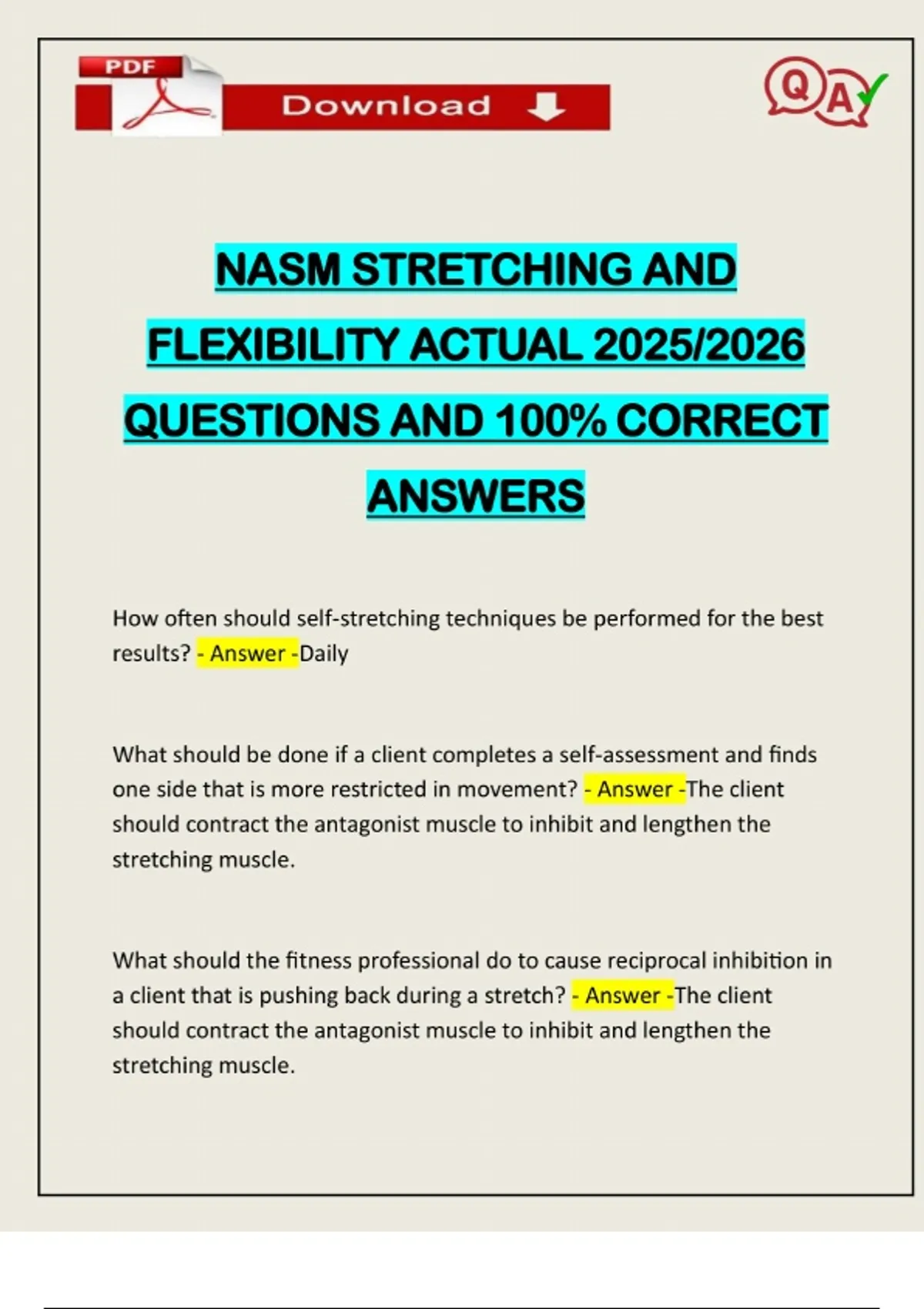 NASM STRETCHING AND FLEXIBILITY ACTUAL 2025/2026 QUESTIONS AND 100% CORRECT ANSWERS How often should self-stretching techniques be performed for the best results? - Answer -Daily What should be done if a client completes a self-assessment and finds one side that is more restricted in movement? - Answer -The client should contract the antagonist muscle to inhibit and lengthen the stretching muscle. What should the fitness professional do to cause reciprocal inhibition in a client that is pushing back during a stretch? - Answer -The client should contract the antagonist muscle to inhibit and lengthen the stretching muscle.Need assistance on Online classes, Exams & Assignments? Reach out for instant help!! Full Course Assistance, Plagiarism-free Essay Writing, Research Paper, Dissertation, Discussion Posts, etc…. Confidential & Secure services. Tutors are available for all subjects! Email now at: Which system indicates whether or not a client is being honest with the fitness professional about how they are feeling during a session? - Answer -Interoceptive Which of the following is a neurophysiological effect of rolling myofascia? - Answer -Improvement of tissue relaxation. How should the traction during the adductor stretch be completed? - Answer -Through the hip leaning away Which of the following terms defines the concept that a client's primary complaint is affected by dysfunction in remote musculoskeletal regions? - Answer -Regional interdependence model Which of the following terms defines the neuromuscular system's capacity to activate muscle synergies at the correct time with appropriate force to complete functional tasks with the least amount of stress and energy to the HMS? - Answer -Functional efficiencyWhich of the following can disrupt the balance of tension and compression which help to optimize and maintain movement? - Answer -Traumatic injury When is it recommended that a client perform self-myofascial techniques? - Answer -Before stretching Which of the following is the best way for a fitness professional to build client confidence during a stretching session? - Answer -Consistent practice and feedback with like-mind