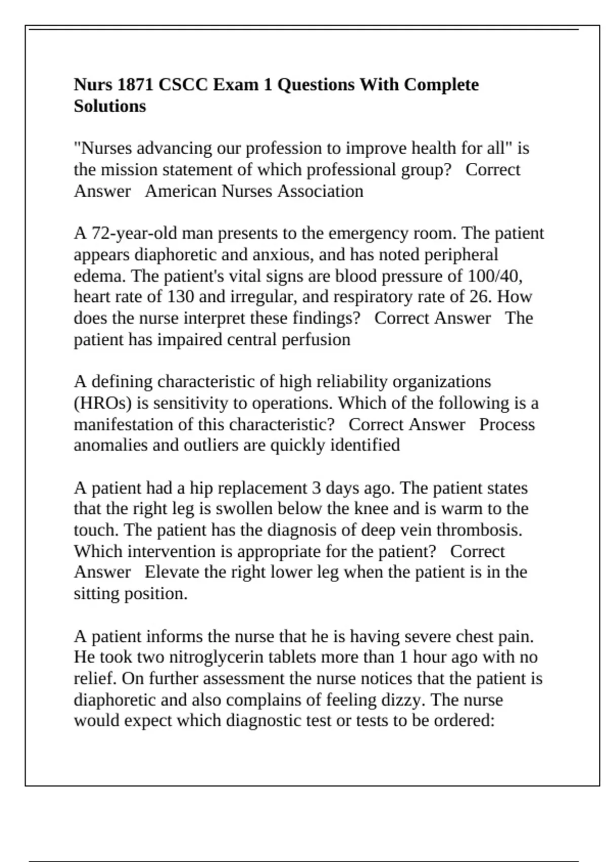 A patient informs the nurse that he is having severe chest pain.