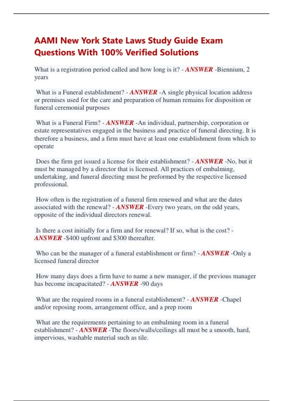 AAMI New York State Laws Study Guide Exam Questions With 100% Verified Solutions What is a registration period called and how long is it? - ANSWER -Biennium, 2 years What is a Funeral establishment? - ANSWER -A single physical location address or premises used for the care and preparation of human remains for disposition or funeral ceremonial purposes What is a Funeral Firm? - ANSWER -An individual, partnership, corporation or estate representatives engaged in the business and practice of funeral directing. It is therefore a business, and a firm must have at least one establishment from which to operate Does the firm get issued a license for their establishment? - ANSWER -No, but it must be managed by a director that is licensed. All practices of embalming, undertaking, and funeral directing must be preformed by the respective licensed professional. How often is the registration of a funeral firm renewed and what are the dates associated with the renewal? - ANSWER -Every two years, on the odd years, opposite of the individual directors renewal. Is there a cost initially for a firm and for renewal? If so, what is the cost? - ANSWER -$400 upfront and $300 thereafter. Who can be the manager of a funeral establishment or firm? - ANSWER -Only a licensed funeral director How many days does a firm have to name a new manager, if the previous manager has become incapacitated? - ANSWER -90 days What are the required rooms in a funeral establishment? - ANSWER -Chapel and/or reposing room, arrangement office, and a prep room What are the requirements pertaining to an embalming room in a funeral establishment? - ANSWER -The floors/walls/ceilings all must be a smooth, hard, impervious, washable material such as tile. Must be adequately ventilated with exhaust fans and well lit. Must have hot and cold water, and a utility sink. Must have closets or cabinets for supplies. Must have adequate sewage/drainage systems. Doors must close tightly and window should have no view inside. The prep table must be nonporous. There must be convenient receptacles for waste. How large must the lettering be on the funeral home sign? - ANSWER -1 1/2 inches Where must the registration of the funeral firm as well as the license of the manager be displayed? - ANSWER -Conspicuously displayed in the establishment. Can the use of names of unlicensed person be used in advertising? On signs? - ANSWER -No Can alcohol be served in the funeral home? - ANSWER -No Can you cook and prepare food in the facility to be served? - ANSWER -The preparation and serving of food and nonalcoholic beverages in the funeral establishment shall be limited to arranging, opening, displaying, and assembling items for consumption, and does not include cooking or heating of food items with the exception of hot beverages such as coffee, tea or similar items. Where must all food and beverage be consumed? Can the deceased be present during visitor consumption? - ANSWER -There must be a specific area for food service. Eating is prohibited in the chapel and reposing room, so the deceased cannot be present If a funeral firm wants to charge for the use of facilities for serving food and beverage, what are the requirements? - ANSWER -Any separate charges that my be used for accommodations, cleaning, equipment, etc. that may come with this must be clearly stated on the general price list. What are the 4 steps to become a Licensed Funeral Director in the state of New York? - ANSWER -Completion of an accredited mortuary college, pass the national board exam, completion of 1 year of residency at a funeral home, pass the state law exam. How often is the registration of an individual's license renewed and what are the dates associated with the renewal? - ANSWER -Every two years, on the even years. What is the cost associated with an individual renewal? - ANSWER -$125 What is the fee for requesting a Duplicate License? - ANSWER -$20 How do you notify the State of a change of address and how? - ANSWER -In writing within 10 days How many hours of Continuing Education must a funeral director take each biennium? - ANSWER -12 hours How many of continuing education hours must be live classroom instruction? - ANSWER -50% Is there a particular subject area required for continuing education that must be done live and how many hours must relate to these subjects? - ANSWER -At least 2 hours of credits must be applicable to New York State laws and regulations affecting funeral directing, embalming, embalming and preneed services Does a newly licensed funeral director have to take continuing education in his/her first biennium? - ANSWER -No If a director is convicted of a felony, do they lose their professional license? - ANSWER -Yes Must a body be embalmed for a direct burial or cremation? - ANSWER -No How large must the prices on casket and vault signs be? - ANSWER -1/2 inch numbers or larger Can you charge for Topical Disinfection when embalming has been selected? - ANSWER -No