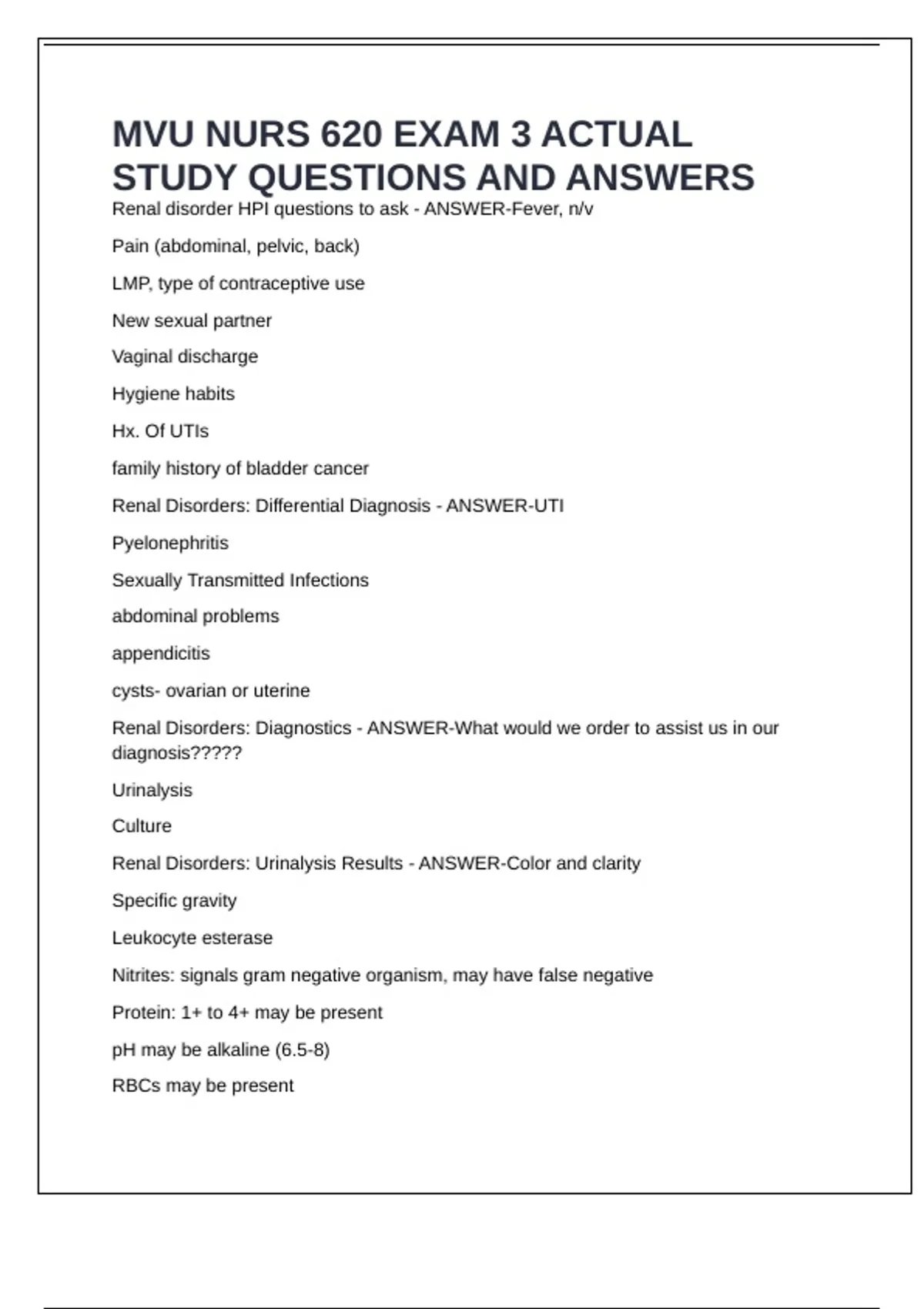 Renal Disorders: Differential Diagnosis - ANSWER-UTI