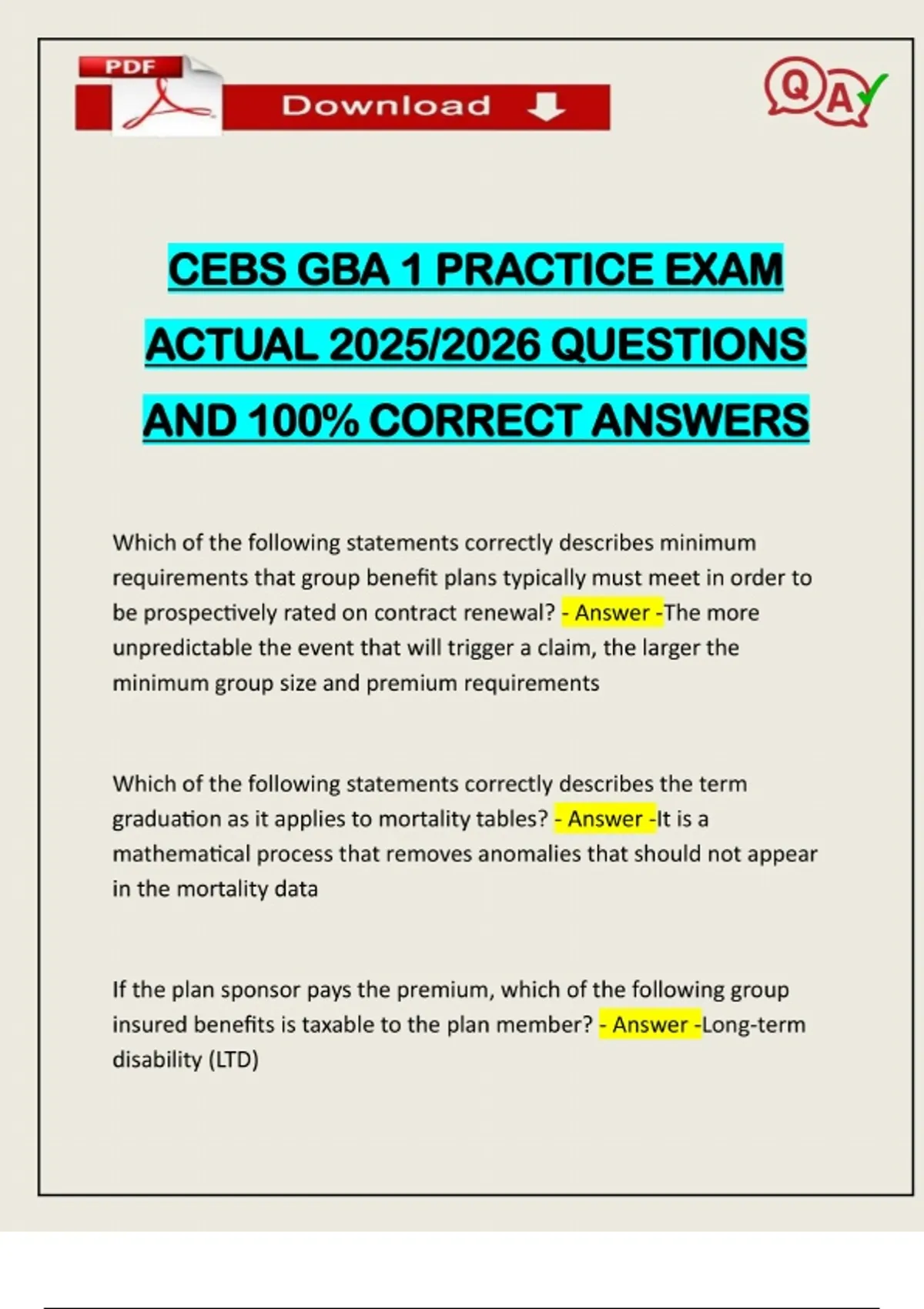 CEBS GBA 1 PRACTICE EXAM ACTUAL 2025/2026 QUESTIONS AND 100% CORRECT ANSWERS Which of the following statements correctly describes minimum requirements that group benefit plans typically must meet in order to be prospectively rated on contract renewal? - Answer -The more unpredictable the event that will trigger a claim, the larger the minimum group size and premium requirements Which of the following statements correctly describes the term graduation as it applies to mortality tables? - Answer -It is a mathematical process that removes anomalies that should not appear in the mortality data If the plan sponsor pays the premium, which of the following group insured benefits is taxable to the plan member? - Answer -Long-term disability (LTD)Need assistance on Online classes, Exams & Assignments? Reach out for instant help!! Full Course Assistance, Plagiarism-free Essay Writing, Research Paper, Dissertation, Discussion Posts, etc…. Confidential & Secure services. Tutors are available for all subjects! Email now at: Which of the following statements correctly describes phases of a group plan marketing? - Answer -Plan features of both contributory and noncontributory benefit plans must be communicated to plan members during the enrollment process Which of the following statements correctly describes a characteristic of an insurable risk? - Answer -The loss must have financial significance to the insured (The loss must not be catastrophic to the insurer. Option C: The loss must occur by chance. Option D: The loss must be predictable for the insurer.) With respect to marketing a group insurance plan, which of the following statements best describes insurer representatives known as account executives? - Answer -They are involved in enrolling group members and installing new plans Which of the following statements correctly describes the statistical concept known as the law of large numbers? - Answer -Future probabilities of loss are not valid unless a large number of incidents exist to ensure the outcomes are less likely to deviateWhich of the following statements correctly describes an insured plan that is insurer-administered? - Answer -For self-insured plans with an administrative services only (ASO) arrangement, the insurer bills the plan sponsor monthly for adminis