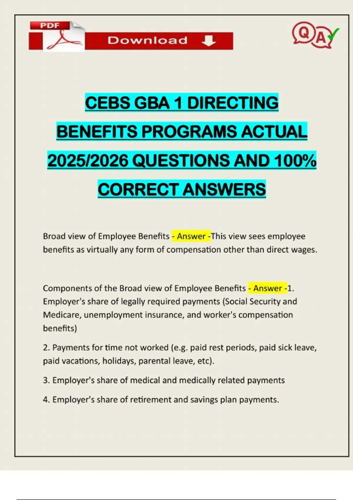 CEBS GBA 1 DIRECTING BENEFITS PROGRAMS ACTUAL 2025/2026 QUESTIONS AND 100% CORRECT ANSWERS Broad view of Employee Benefits - Answer -This view sees employee benefits as virtually any form of compensation other than direct wages. Components of the Broad view of Employee Benefits - Answer -1. Employer's share of legally required payments (Social Security and Medicare, unemployment insurance, and worker's compensation benefits) 2. Payments for time not worked (e.g. paid rest periods, paid sick leave, paid vacations, holidays, parental leave, etc). 3. Employer's share of medical and medically related payments 4. Employer's share of retirement and savings plan payments.Need assistance on Online classes, Exams & Assignments? Reach out for instant help!! Full Course Assistance, Plagiarism-free Essay Writing, Research Paper, Dissertation, Discussion Posts, etc…. Confidential & Secure services. Tutors are available for all subjects! Email now at: 5. Miscellaneous benefit payments (inducing employee discounts, severance pay, educational expenditures, and child care). Employer's Share of Legally Required Payments - Answer -Social Security, Medicare, Unemployment Insurance, & Workers Compensation Narrow View of Employee Benefits - Answer -Any type of plan sponsored or initiated unilaterally or jointly by employers and employees in providing benefits that stem from the employment relationship that are not underwritten