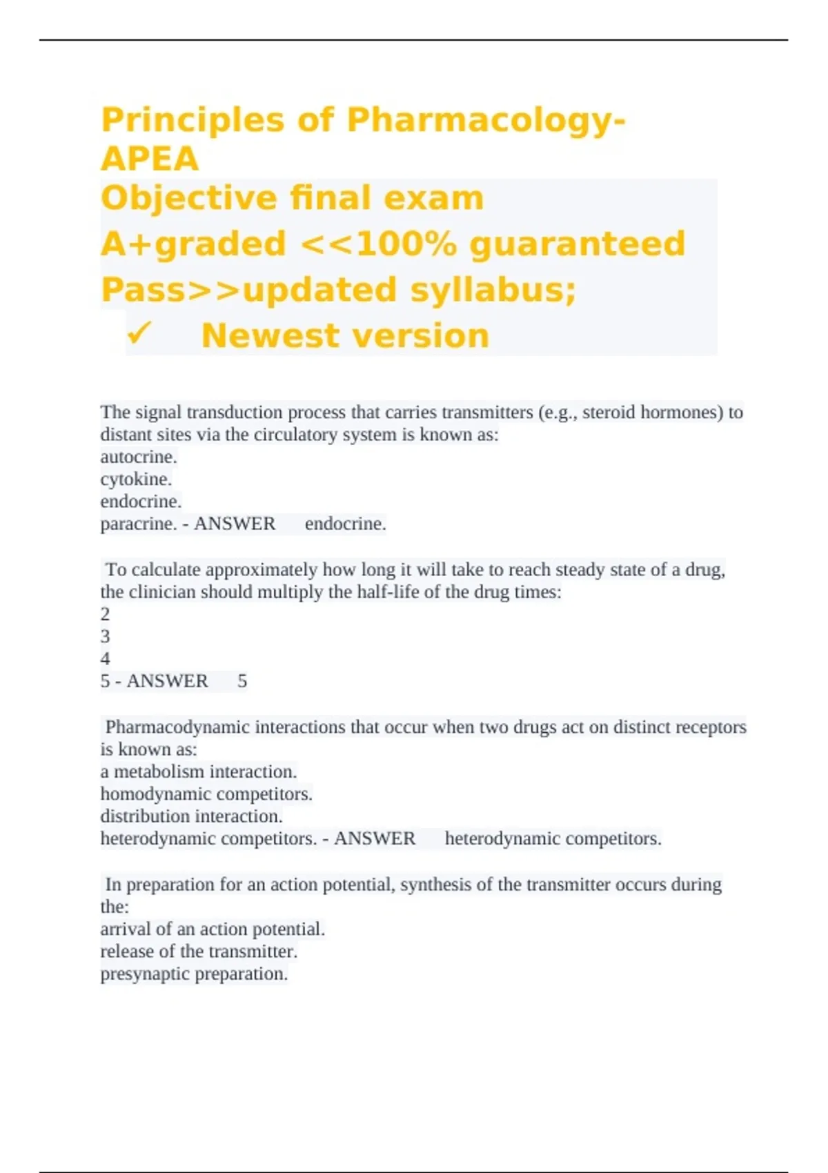 Principles of Pharmacology- APEA Objective final exam A+graded 100% guaranteed Passupdated syllabus;  Newest version The signal transduction process that carries transmitters (e.g., steroid hormones) to distant sites via the circulatory system is known as: autocrine. cytokine. endocrine. paracrine. - ANSWER endocrine. To calculate approximately how long it will take to reach steady state of a drug, the clinician should multiply the half-life of the drug times: 2 3 4 5 - ANSWER 5 Pharmacodynamic interactions that occur when two drugs act on distinct receptors is known as: a metabolism interaction. homodynamic competitors. distribution interaction. heterodynamic competitors. - ANSWER heterodynamic competitors. In preparation for an action potential, synthesis of the transmitter occurs during the: arrival of an action potential. release of the transmitter. presynaptic preparation. receptor interaction. - ANSWER presynaptic preparation. The scientific study of origin, composition, mode of action, therapeutic use and toxicology is known as: pharmacotherapeutics. receptor theory. pharmacokinetics. pharmacology. - ANSWER pharmacology. The fusion of the synaptic vesicles to the presynaptic plasma membrane is preceded by the influx of: sodium ions. chloride ions. calcium ions. potassium ions. - ANSWER calcium ions. The correct order of the transmission of a neurotransmitter is presynaptic preparation followed by the: release of a transmitter, arrival of action potential, receptor interaction, and termination of transmitter action. arrival of action potential, receptor interaction, release of transmitter, and termination of transmitter action. release of transmitter, receptor interaction, arrival of action potential, and termination of transmitter action. arrival of action potential, release of transmitter, receptor interaction, and the termination of transmitter action. - ANSWER arrival of action potential, release of transmitter, receptor interaction, and the termination of transmitter action. The term NOT associated with the pharmacokinetics of a drug is: bioavailability. distribution. clearance. pharmacodynamics. - ANSWER pharmacodynamics. Pharmacokinetics is: the effect the drug has on the body. the adverse response of the drug on the body. the effect the body has on the drug. the clinical formulation of the drug. - ANSWER the effect the body has on the drug. Neurotransmitters are considered: chemical substances. electrical impulses. vesicles. nerve endings. - ANSWER chemical substances.